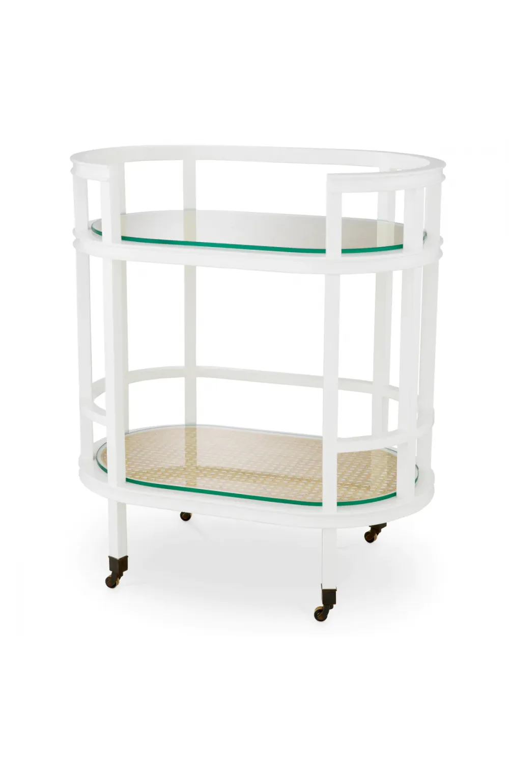 A refined serving trolley featuring elegant cane accents and layered glass shelves, combining modern design with timeless craftsmanship—perfect for entertaining or elevating your interior décor.