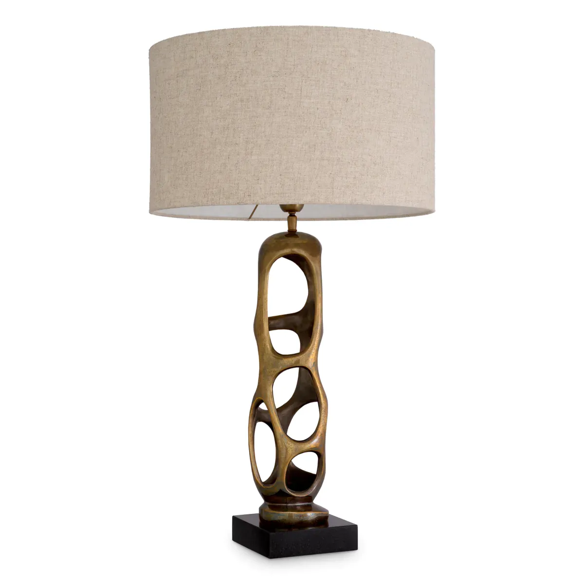 Bring refined character to your space with this modern table lamp, designed for statement ambience. The sculptural cutout-column base showcases a vintage brass finish with a warm, antique-gold/brown patina, creating visual depth from every angle. Resting on a dark black granite base, the lamp feels grounded yet elevated, blending architectural form with a lighter, airy presence. The bronze-toned column features decorative oval cutouts that add a rhythmic pattern and let the lamp’s glow feel more dimensional.