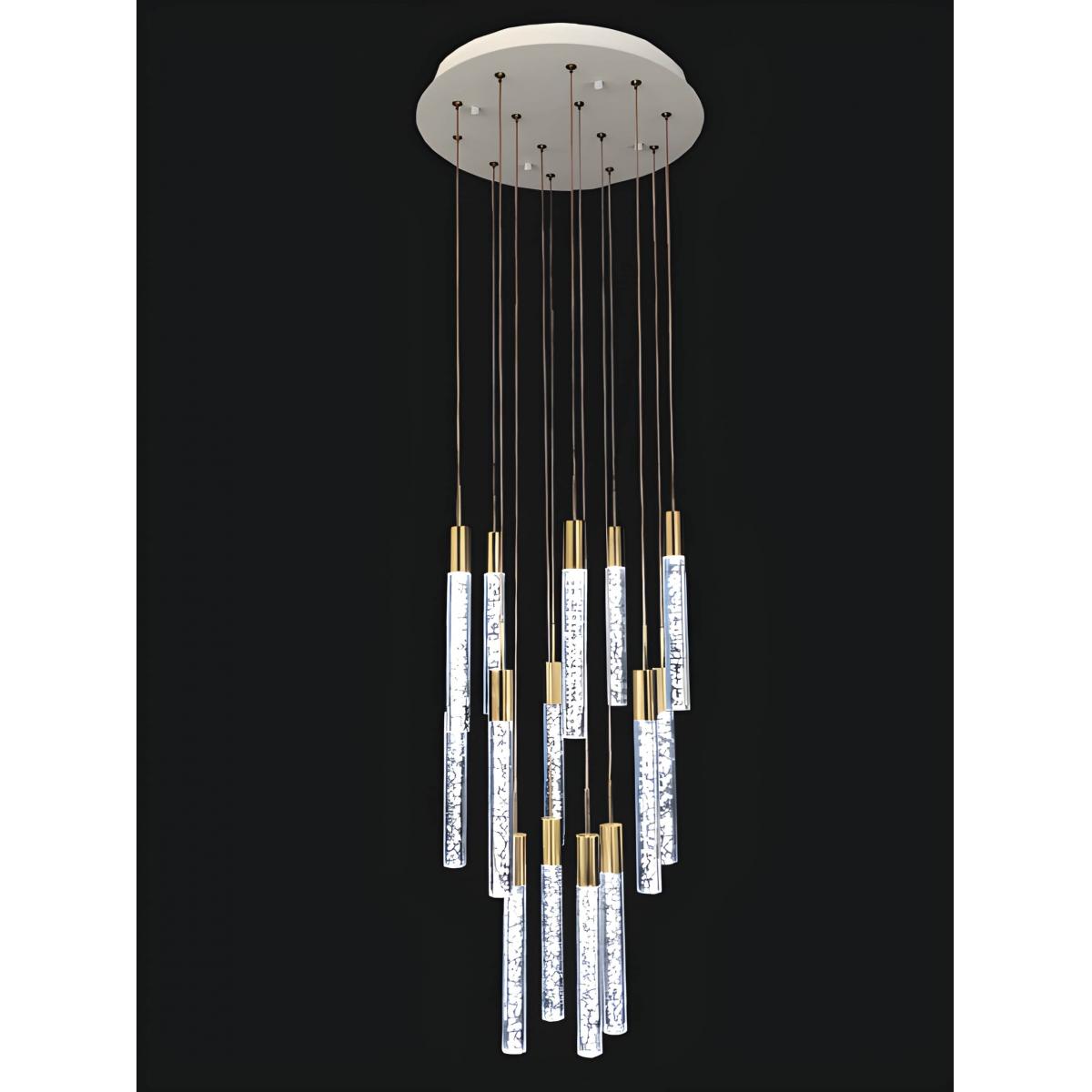 Modern Chandelier style meets sculptural elegance in this ceiling-mounted statement piece: Crystal Chandelier. The curved white canopy creates a clean, contemporary foundation while slender vertical rods descend in a clustered, tiered composition that reads like refined architecture above your space. At the rod ends, small gold-toned caps and delicate connection points help catch and redirect light, giving the overall silhouette an intentional, polished glow. What truly elevates the look is the multi-tier cascading effect formed by cylindrical glass tubes, suspended in varied lengths to create depth and a visually dynamic raindrop-like movement from ceiling to floor. The result is a chandelier that feels both light and substantial—designed to transform an entryway, dining area, or living room into an environment with elevated presence.