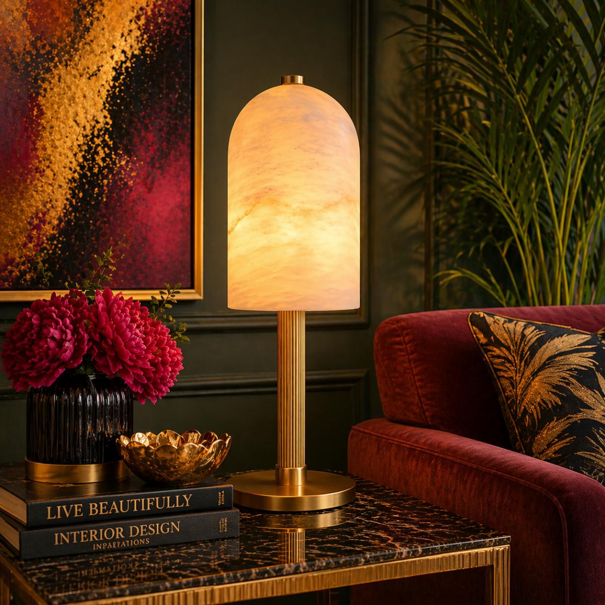 Light flows through the solid, carved alabaster shade to cast a soft, enchanting glow. As illumination diffuses across the room, the lamp highlights depth and atmosphere without overwhelming the space. With its modern table lamp proportions and distinctive detailing, this piece becomes a daily source of comfort and style—perfect for setting the mood from morning routines to evening wind-downs. Elevate your interior ambiance with our luxury table lamp collections, where elegant craftsmanship and gentle illumination create a sophisticated and welcoming living space.