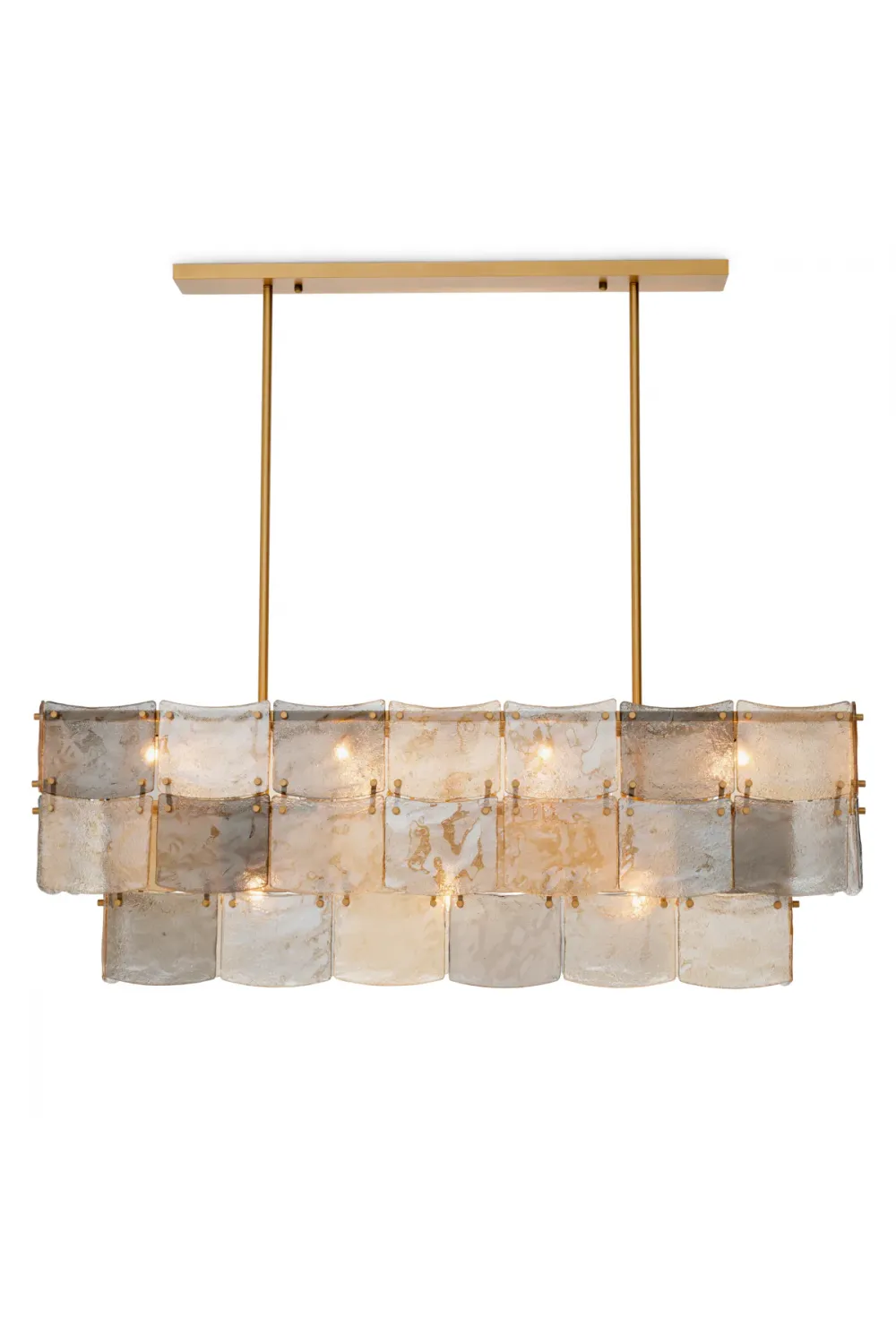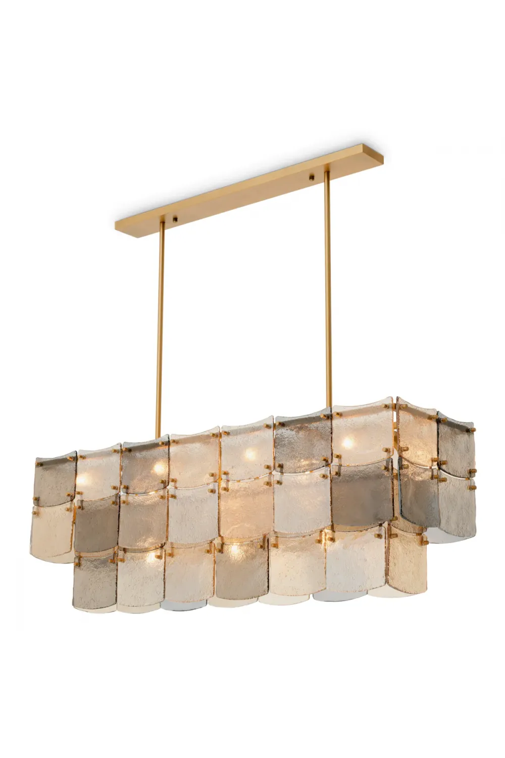 Crafted with an antique brass finish, the chandelier’s clean lines and symmetrical form exude modern sophistication. The handmade glass panels, delicately arranged in smoked and champagne tones, soften the light to create a warm, inviting atmosphere — perfect for intimate dinners or elegant gatherings.