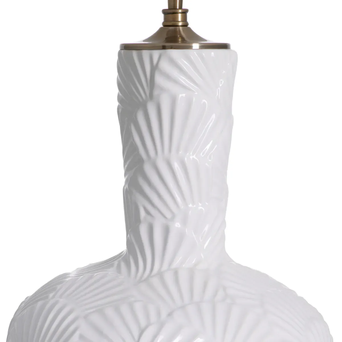 Discover the minimalist allure of this luxury table lamp with a white shade table lamp silhouette. Crafted as an Off-white ceramic table lamp with an antique brass finish table lamp base. Embossed fan-inspired ceramic artistry meets a linen look recycled yarn shade for refined ambiance.