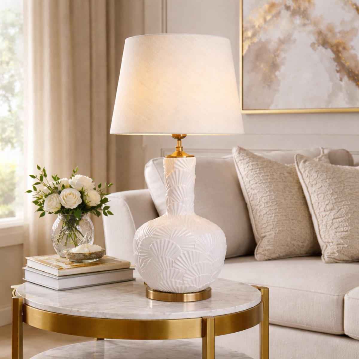 The off-white shade ceramic vase design luxury table lamp with antique brass finish brings timeless elegance and warm ambient lighting to sophisticated interiors. Luxury table lamp styling meets sculptural calm in the Andorra Table Lamp. Crafted from off-white ceramic with a vase-like form, the base is finished with glossy ceramic clarity and a raised embossed fan and leaf-like relief pattern. This tactile design creates soft visual depth even in daylight, while the compact table lamp footprint suits bedside tables, living rooms, and entryway consoles.