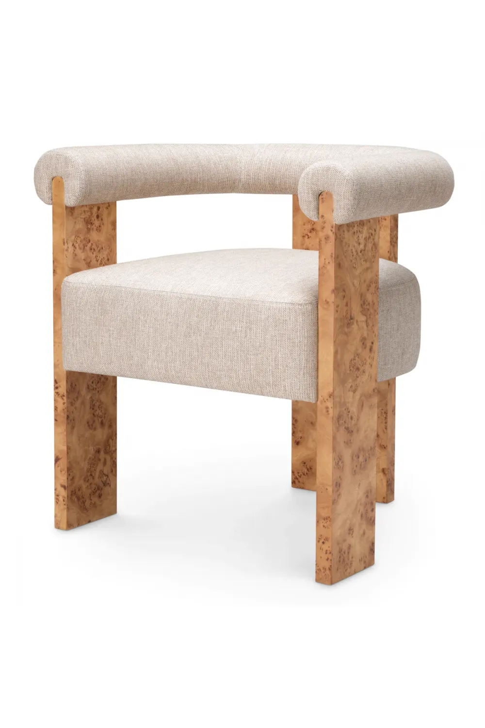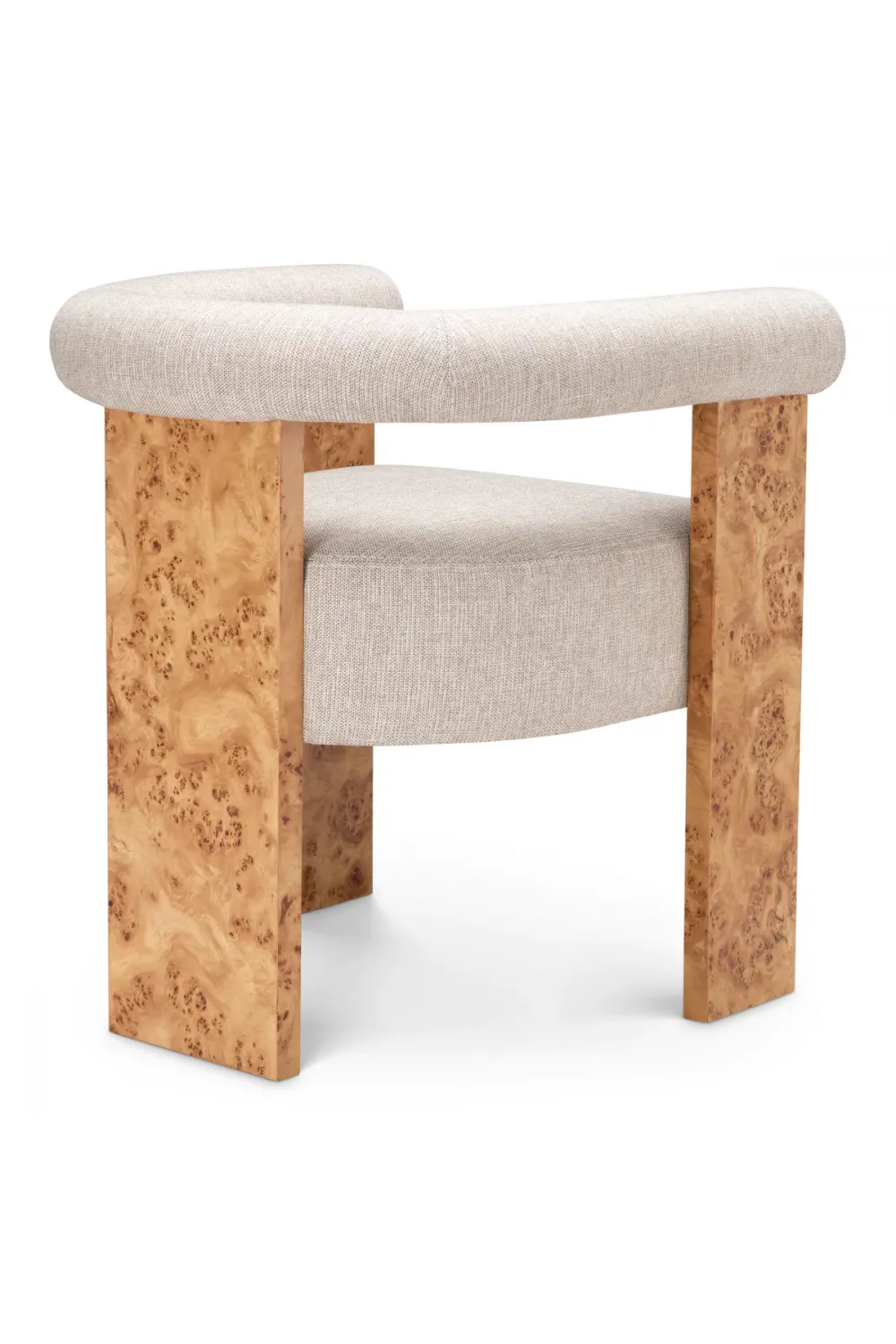 Elevate your dining experience with the Premium Light Brown Designer Dining Chairs, featuring exquisite mappa burl veneer and soft Loki natural upholstery. Crafted for style and comfort, these chairs embody refined design, luxurious texture, and modern sophistication for elegant dining spaces.