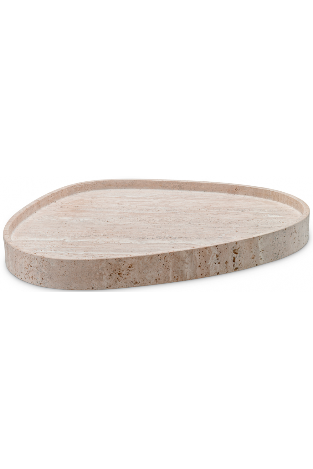 Its flowing, organic silhouette adds a touch of elegance to any space, whether used as a serving tray for entertaining guests or as a decorative accent on a coffee table, console, or sideboard. The weight and texture of travertine lend a sense of durability and premium quality, while the smooth surface ensures practical usability.