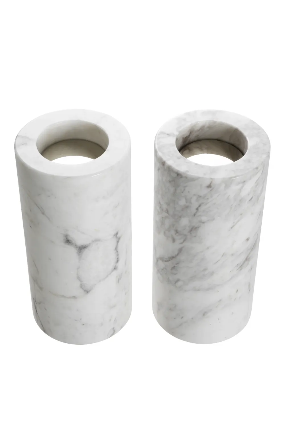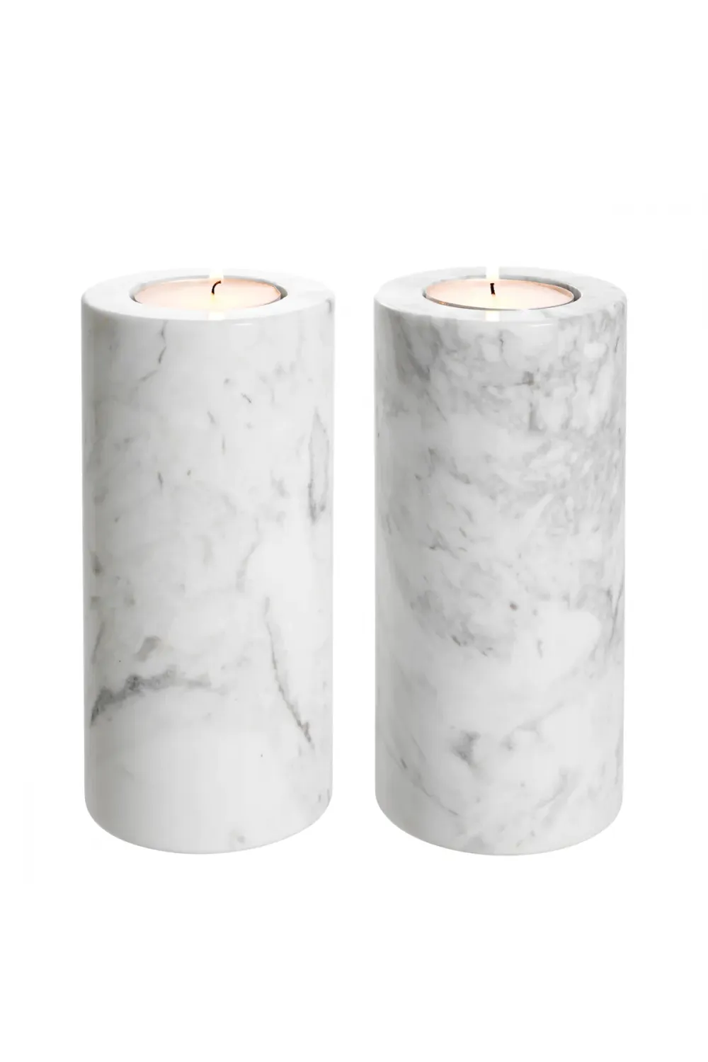Crafted with precision and care, this exquisite set celebrates the timeless beauty of natural stone and the serene glow of candlelight. Each holder is expertly shaped in a minimalist cylindrical form, hand-carved from genuine white marble featuring delicate black and grey veining — ensuring that no two pieces are ever alike.