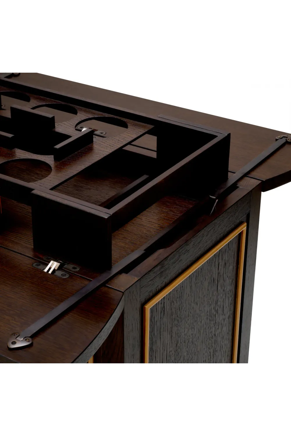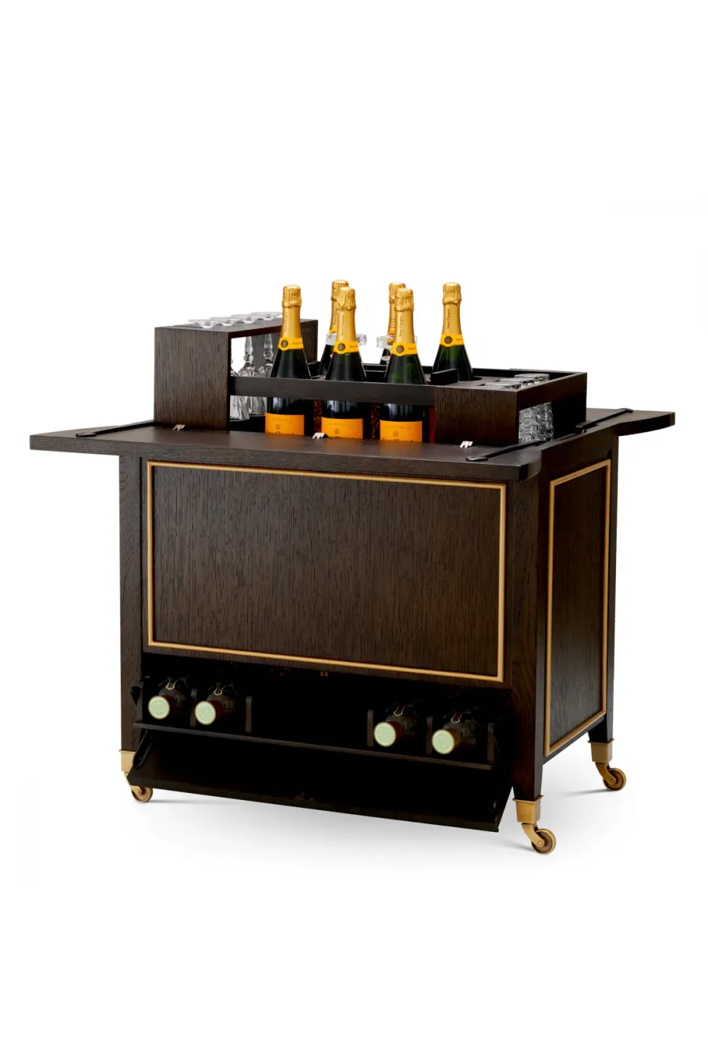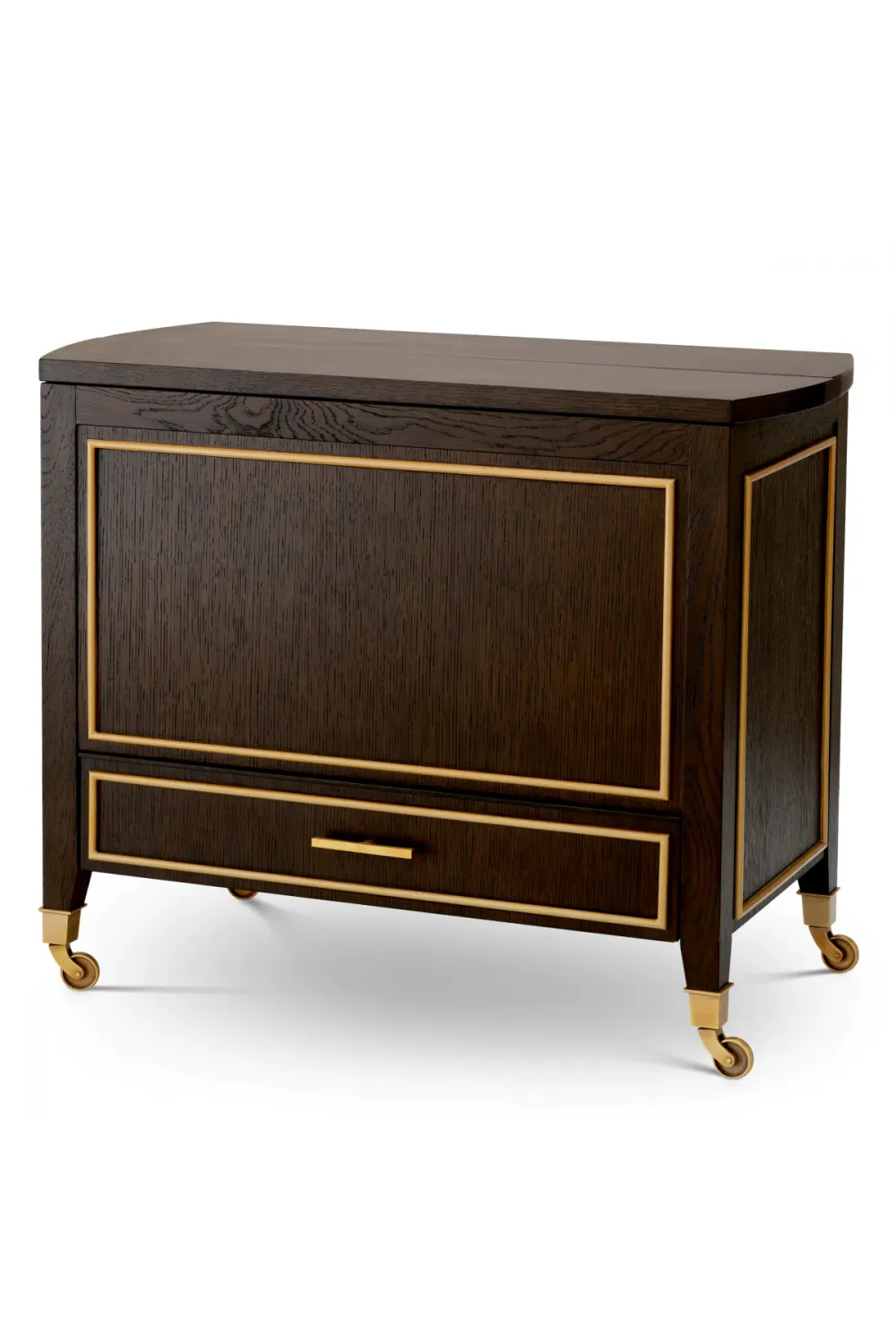 Handcrafted luxury bar trolley in brown oak veneer with brushed bronze accents