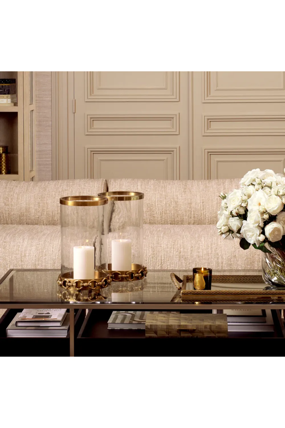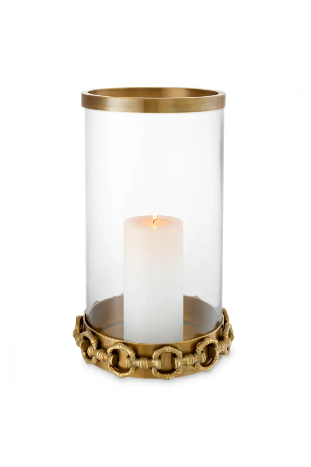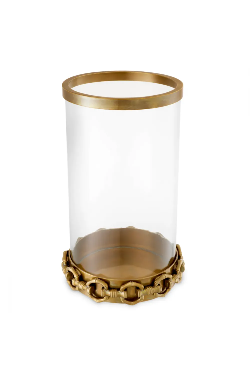 Bring refined sophistication to your interiors with the Royal Clementine Hurricane L. Crafted in vintage brass and paired with clear glass, this elegant cylindrical hurricane adds warmth, depth, and brilliance to any luxury setting. With its graceful form and subtle metallic detailing, it perfectly embodies timeless European elegance.