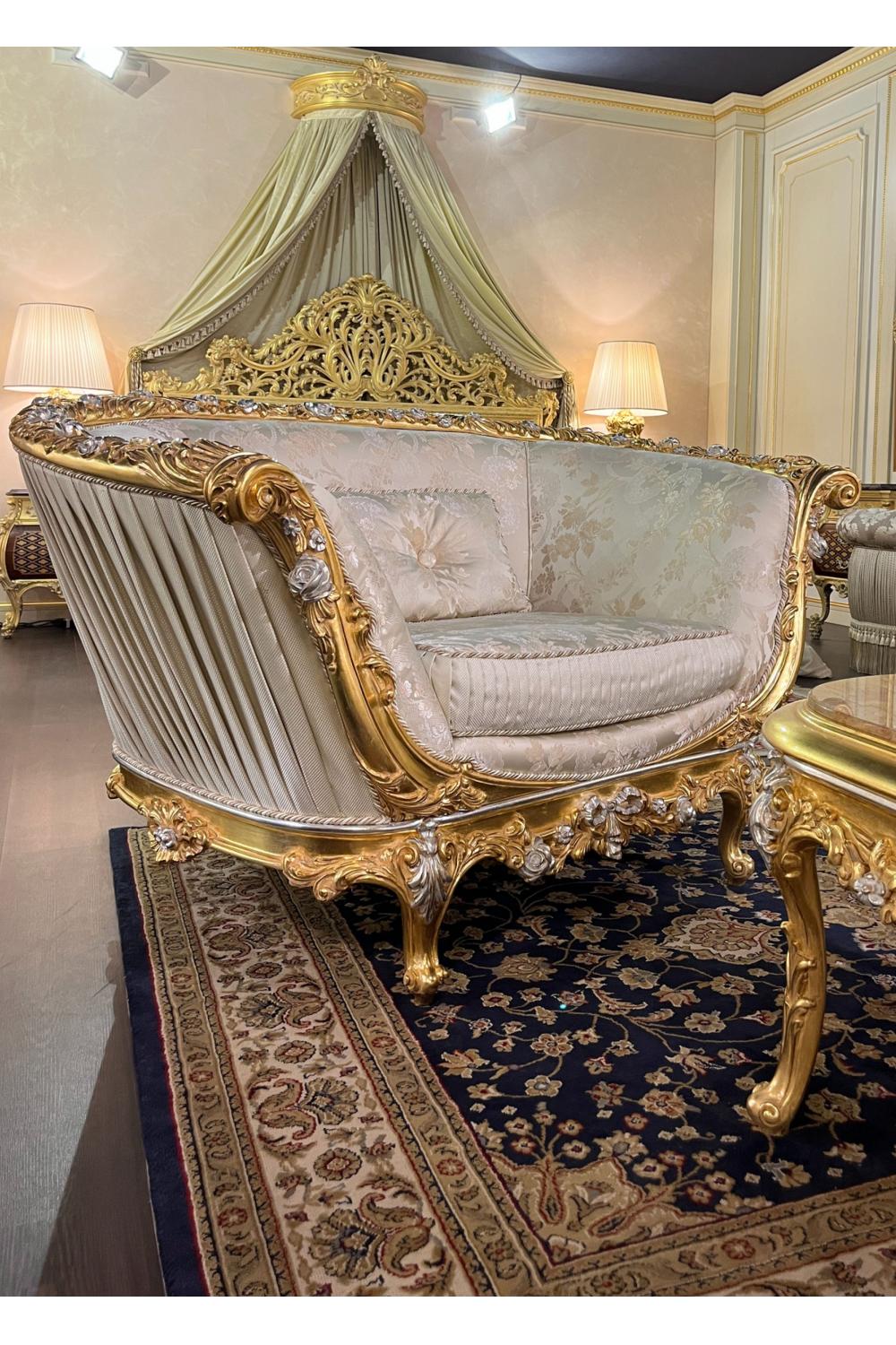 Immerse yourself in the opulence of European royal heritage with the Royal Empire Armchair. Expertly hand-carved by skilled artisans, this chair showcases refined craftsmanship and regal artistry. The radiant gold leaf finish gracefully complements the silver leaf detailing, creating a mesmerizing interplay of light and texture that enhances any luxurious space.