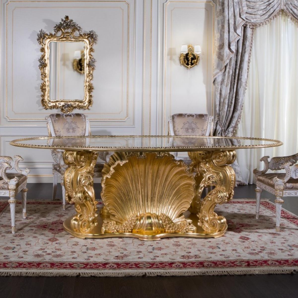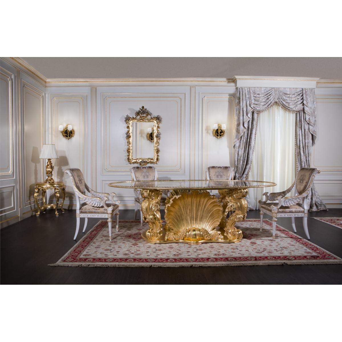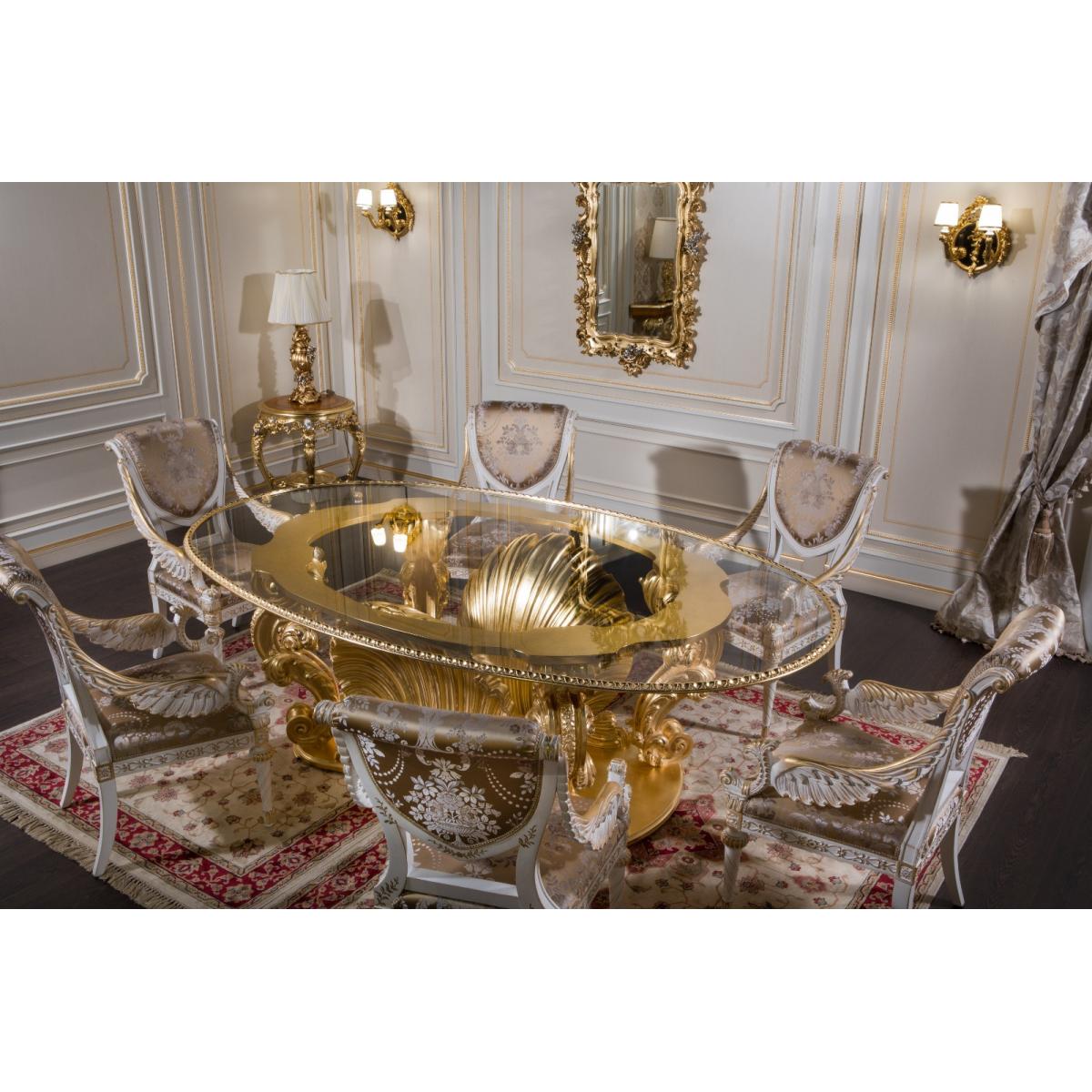 The Royal Empire Oval Table is a testament to European luxury and masterful design. Its oval silhouette is both graceful and commanding, featuring a transparent crystal top that reveals the intricate carvings beneath — all finished in radiant hand-applied gold leaf. The luminous surface captures and reflects light, creating a captivating focal point in any room.