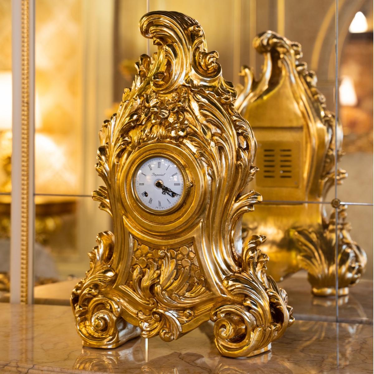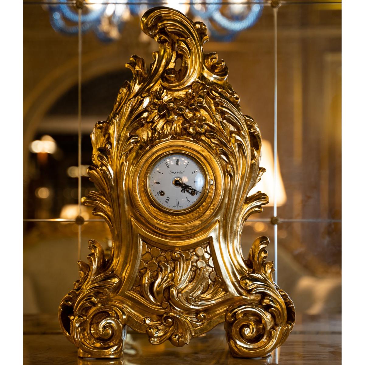 Royal Empire Table Clock – Hand-Carved Luxury Clock with Gold Leaf Finish by Luxury Group International