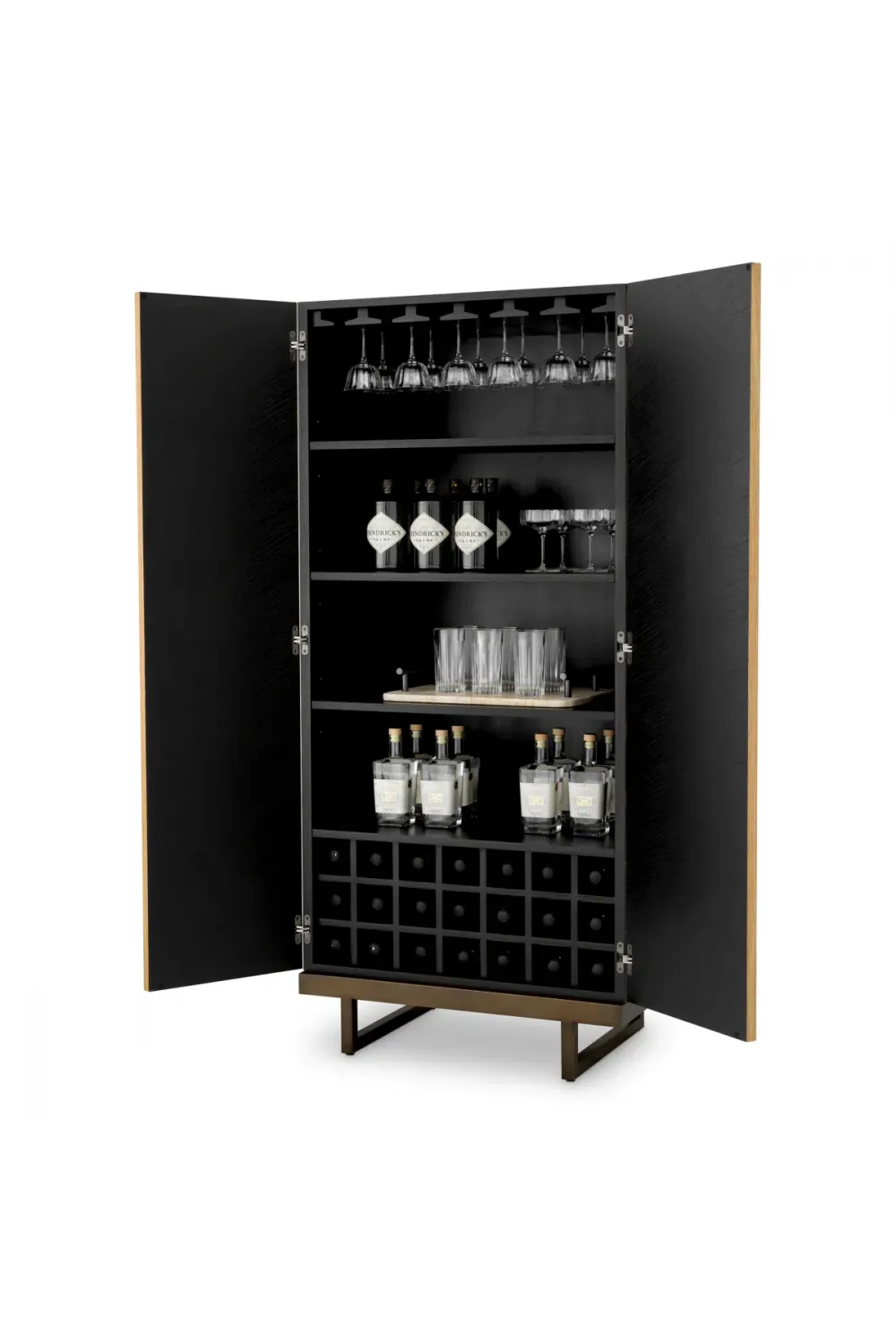 Behind its beautifully finished doors lies a thoughtfully organized interior, accommodating up to 21 bottles and featuring dedicated compartments for glasses, accessories, and hanging stemware racks. This makes it a perfect blend of practicality and poise — ideal for both everyday use and elegant entertaining.