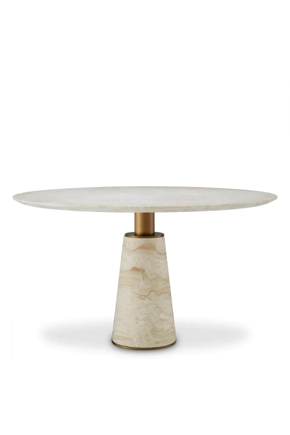 Its smooth, polished surface highlights the natural textures and veins of the travertine, bringing organic warmth and authenticity to your dining space. The brushed brass accents add a subtle yet striking metallic glow, reflecting light and elegance in every angle. Together, these materials create a harmonious composition that speaks of understated opulence and enduring style.