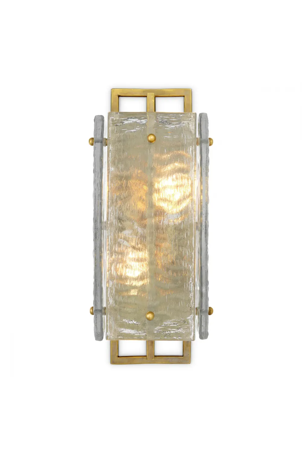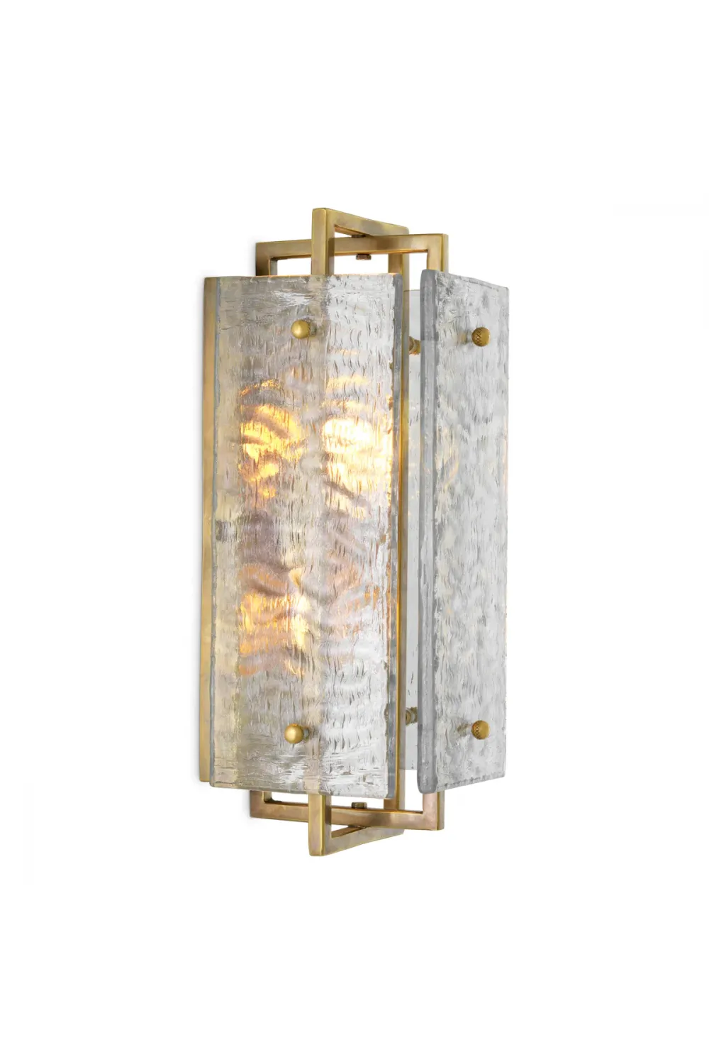 Expertly handcrafted, this wall lamp showcases a vintage brass frame that gracefully envelops rectangular panels of handmade glass, creating a captivating interplay of light, texture, and form.