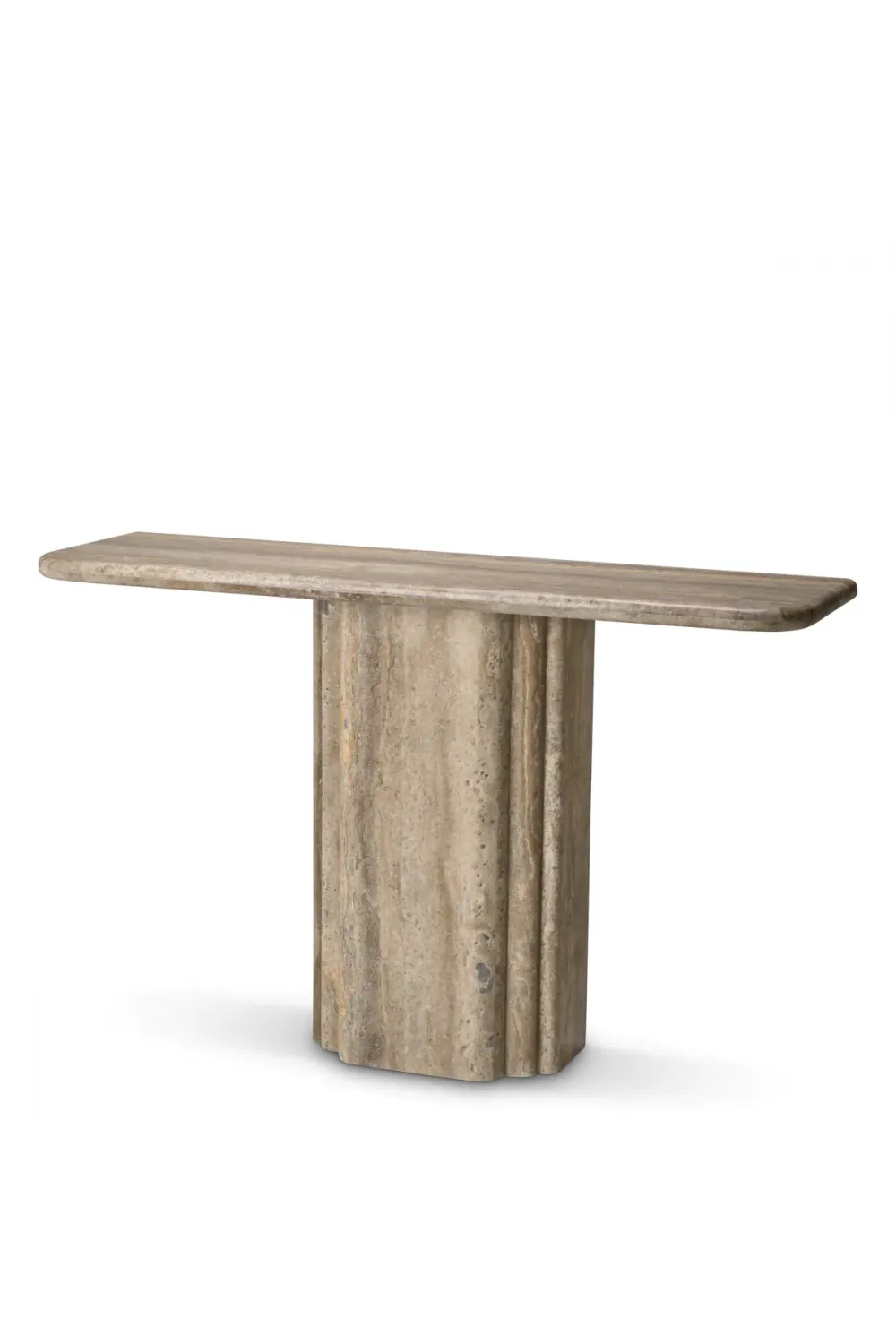 The cool-toned travertine surface exudes a sense of calm and serenity, while the sleek, minimalist silhouette adds an element of contemporary refinement. Expertly finished to perfection, the console’s edges and proportions emphasize modern geometry, creating a striking visual harmony between natural texture and clean design.