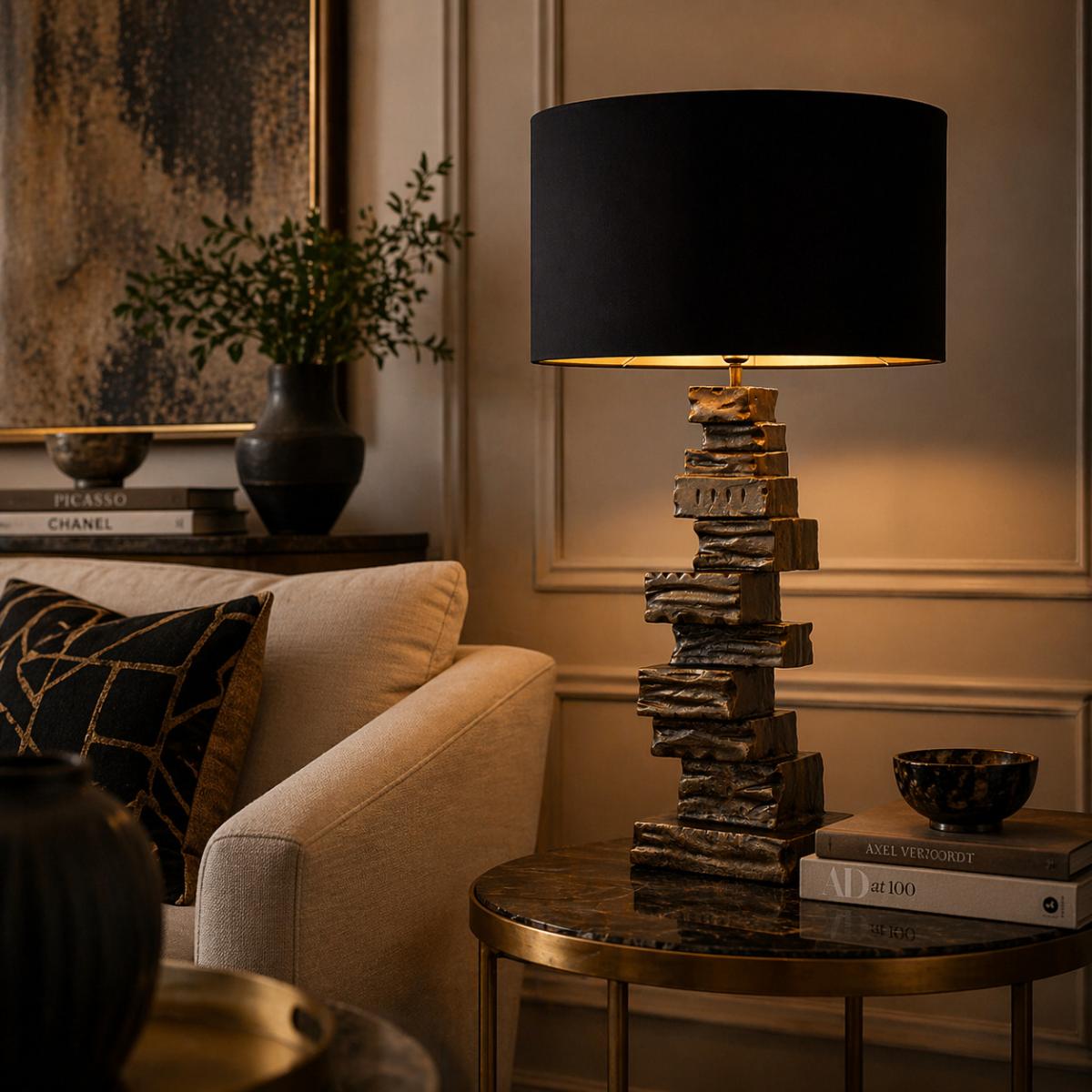 Transform your space with this stunning luxury table lamp, designed to elevate everyday lighting into an elegant focal point. The black lampshade modern table lamp profile delivers a sleek, contemporary look, while the sculpted metal construction supports a premium, lasting presence. A warm, inviting illumination highlights the lamp’s refined character. Illuminate your interiors with our luxury lighting collections, where refined craftsmanship and layered lighting create a beautifully balanced and sophisticated ambiance.