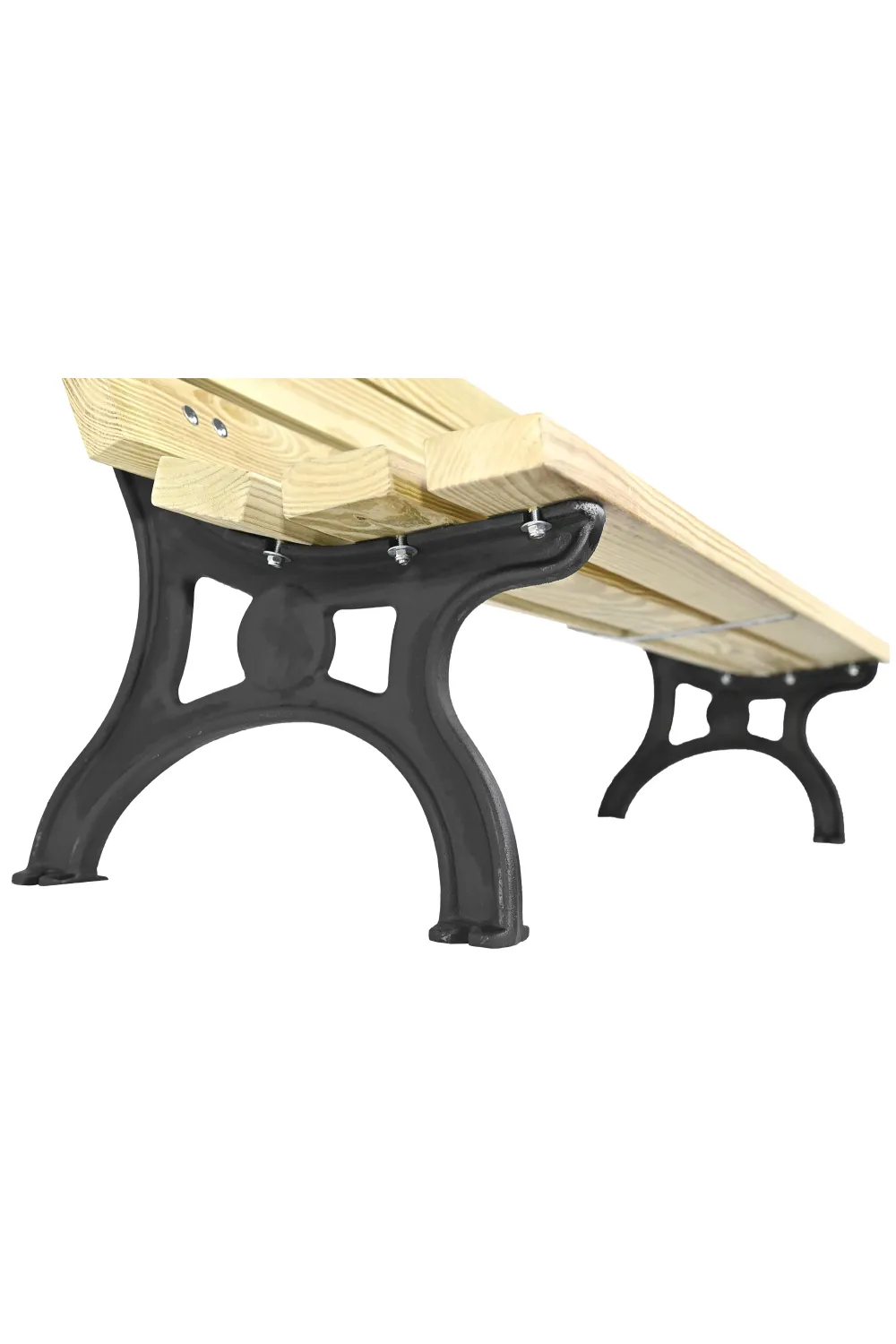 The seat and backrest are made from solid American Yellow Pine, chosen for its resilience, fine texture, and warm grain pattern. This distinctive wood complements the bench’s minimalist structure, offering both comfort and durability. Galvanized steel bolts add strength and stability, ensuring the piece remains steadfast through daily use and changing weather conditions.