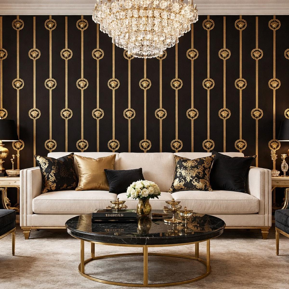 This Versace black gold medusa striped designer wallpaper serves not only as wall décor but as a signature design element. When paired with marble surfaces, velvet furniture, gold lighting fixtures, and sculptural décor, it completes the aesthetic of modern European luxury interiors.