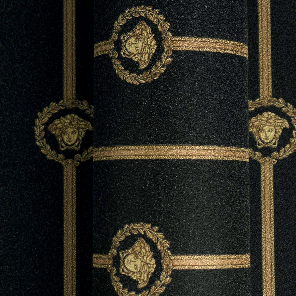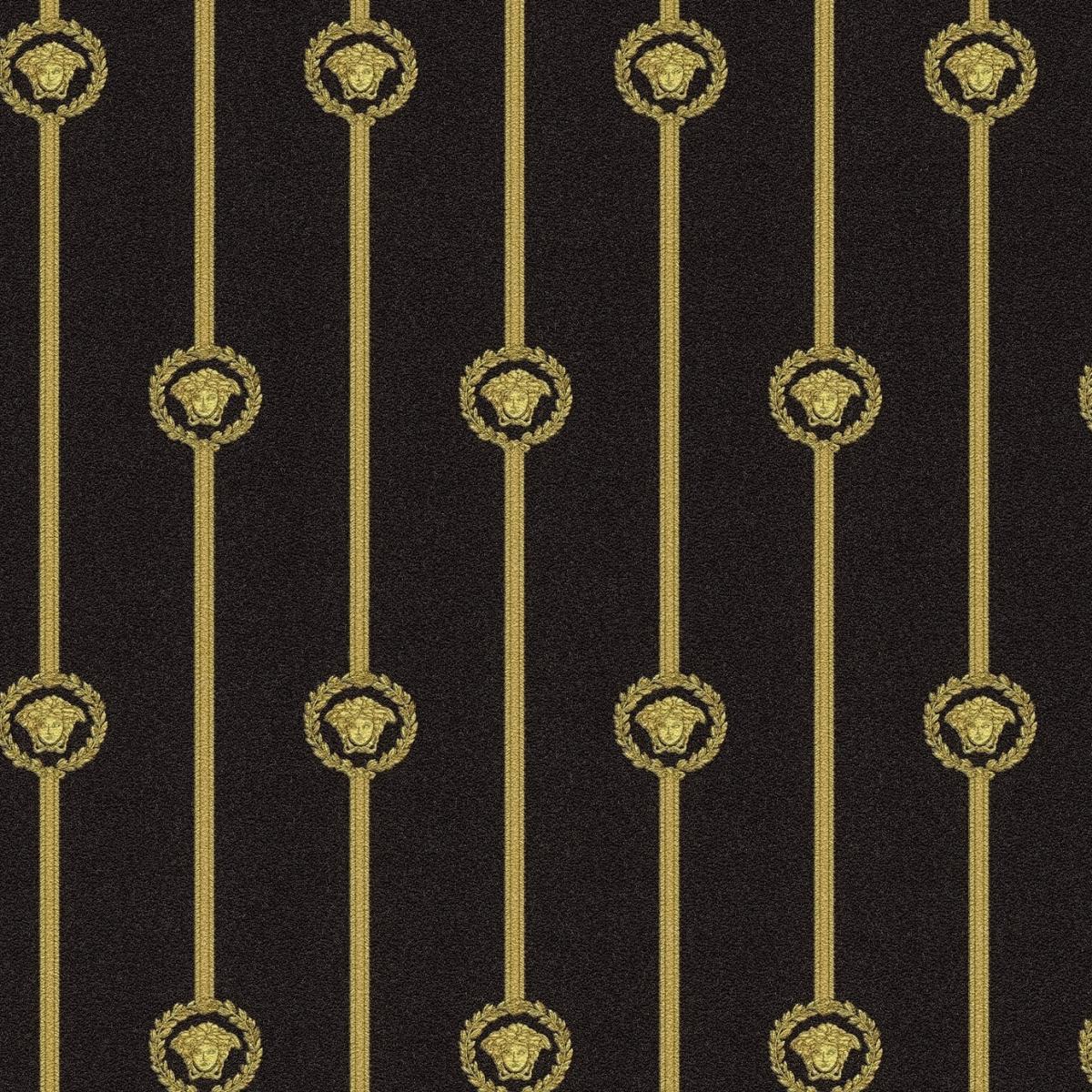 • Premium Versace black gold medusa striped designer wallpaper with textured vinyl finish