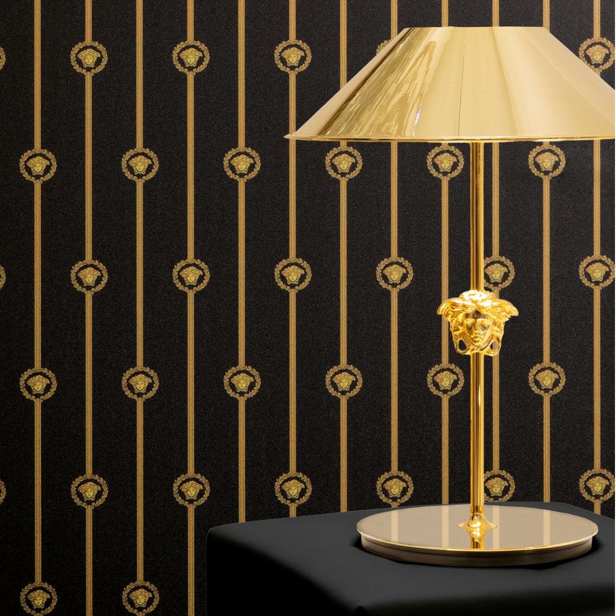Versace black gold medusa striped designer wallpaper features iconic Medusa medallions with bold vertical stripes and metallic gold detailing. This elegant versace wallpaper blends baroque artistry with modern wall décor, creating dramatic statement interiors with textured vinyl and refined European craftsmanship.