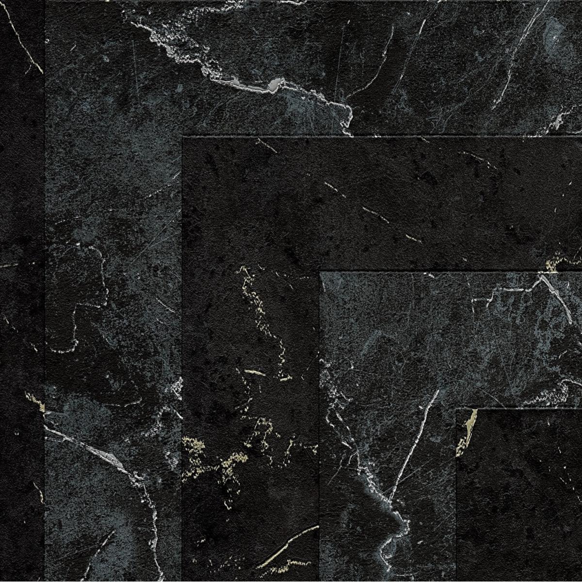 • Versace black marble veining Greek key design metallic texture modern wallpaper features intricate geometric Greek Key patterns and metallic veining for a luxurious aesthetic.