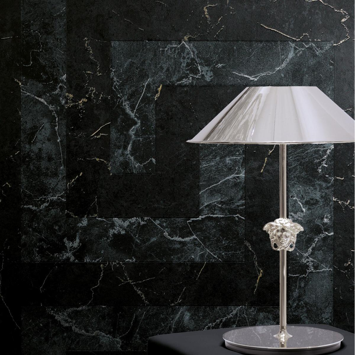 Versace Black Marble Veining Greek Key Design Metallic Texture Modern Wallpaper by Luxury Group International