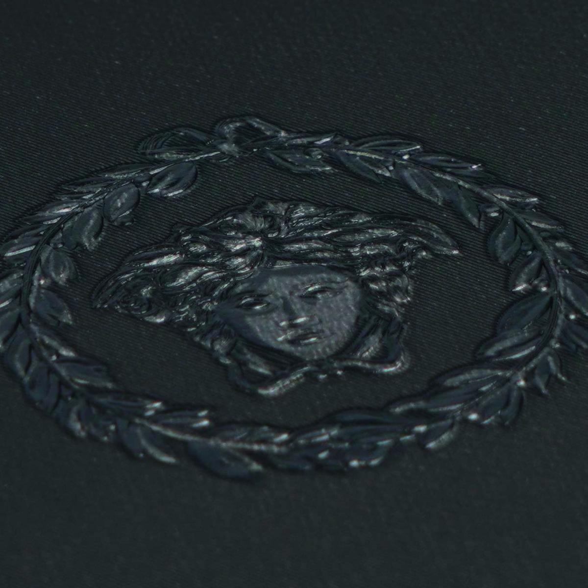 • Features intricate circular Medusa ornaments with silver accents on a black backdrop