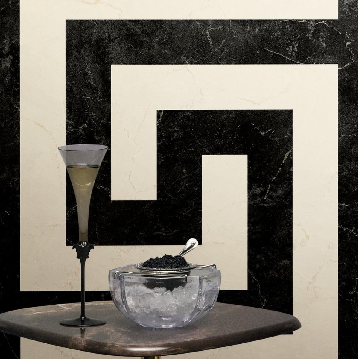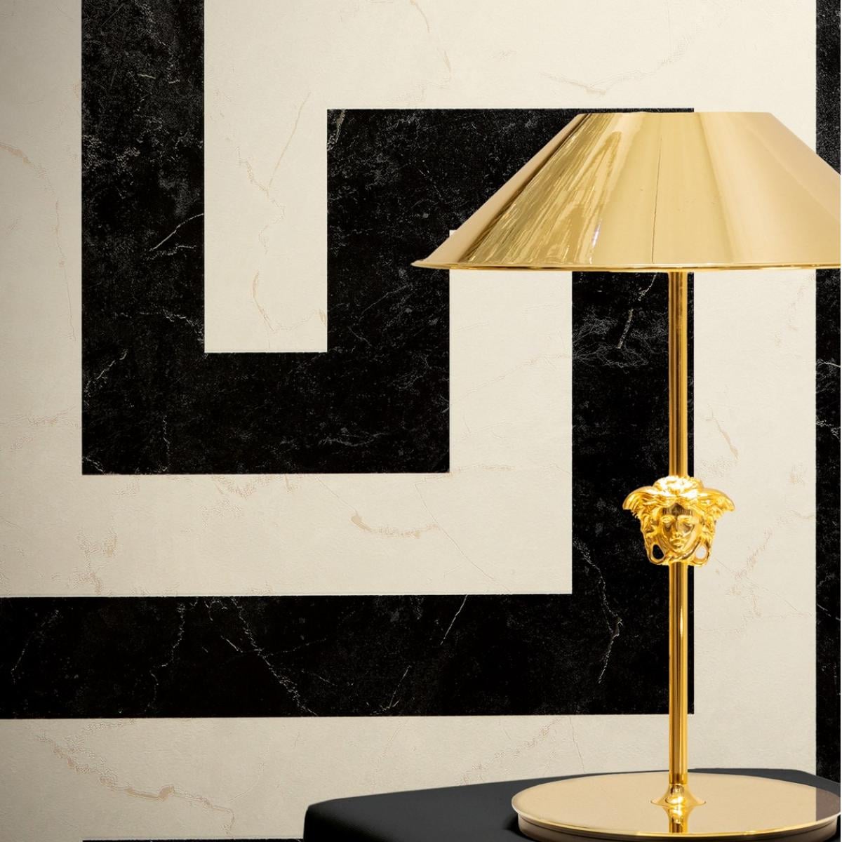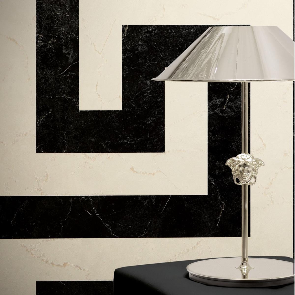 • Versace black & white Greek graphics modern designer wallpaper with bold geometric patterns for a contemporary, luxurious look.