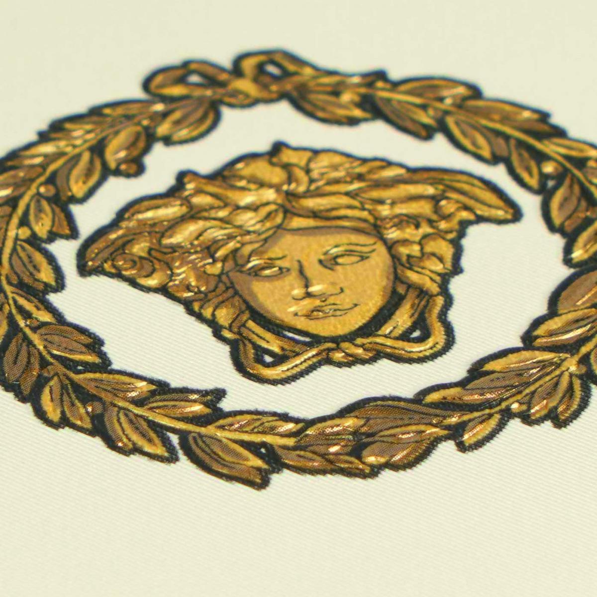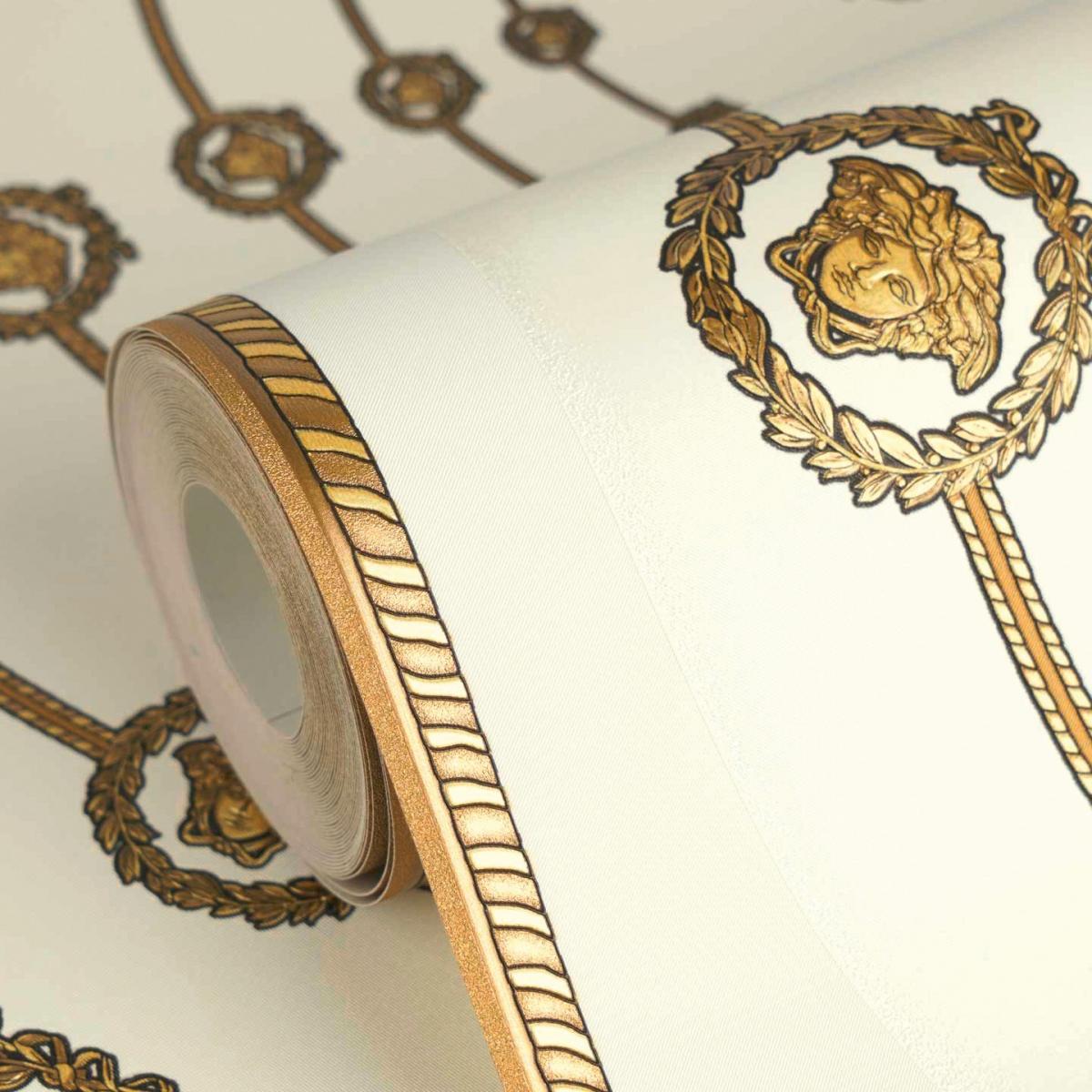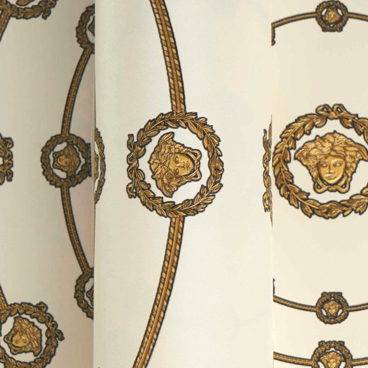 • Iconic versace circular medusa ornaments non woven wallpaper white/gold/black with Medusa motif