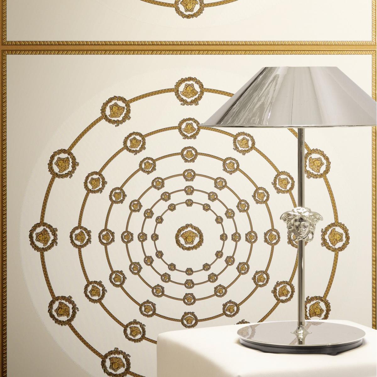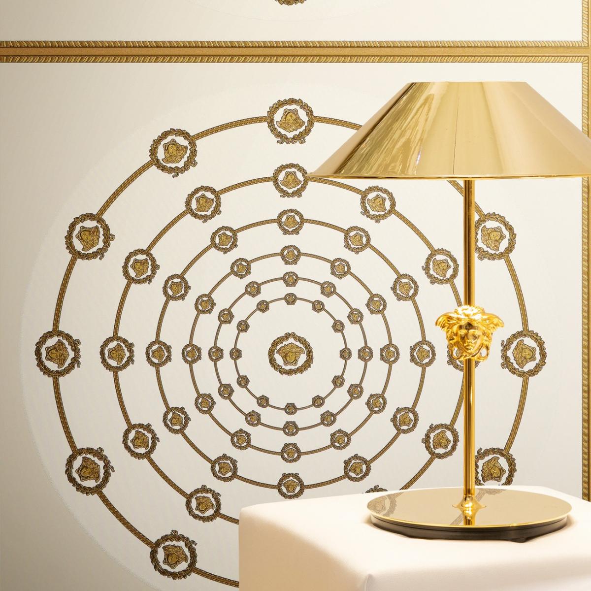 This versace circular medusa ornaments non woven wallpaper white/gold/black acts not only as a wall covering but as a signature interior design feature capable of transforming walls into artistic focal points. Complete the refined interior composition by pairing this wallpaper with an elegant luxury chandelier.