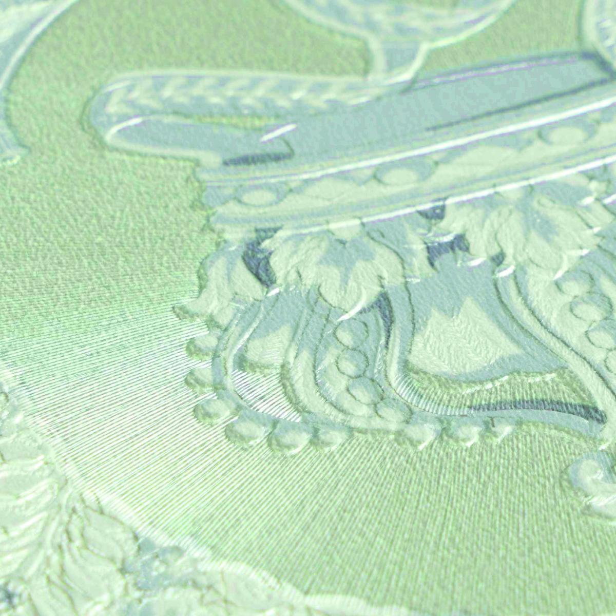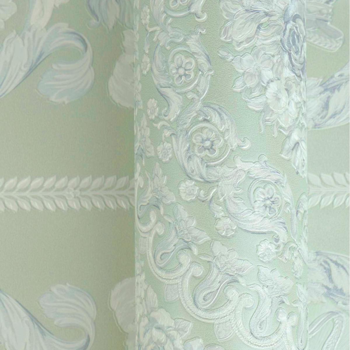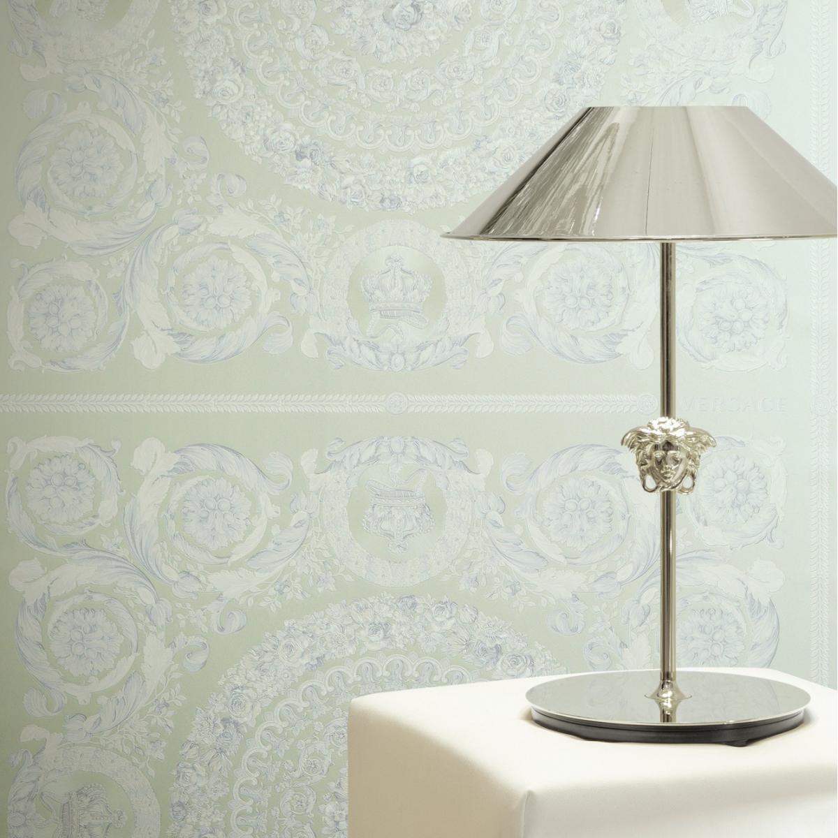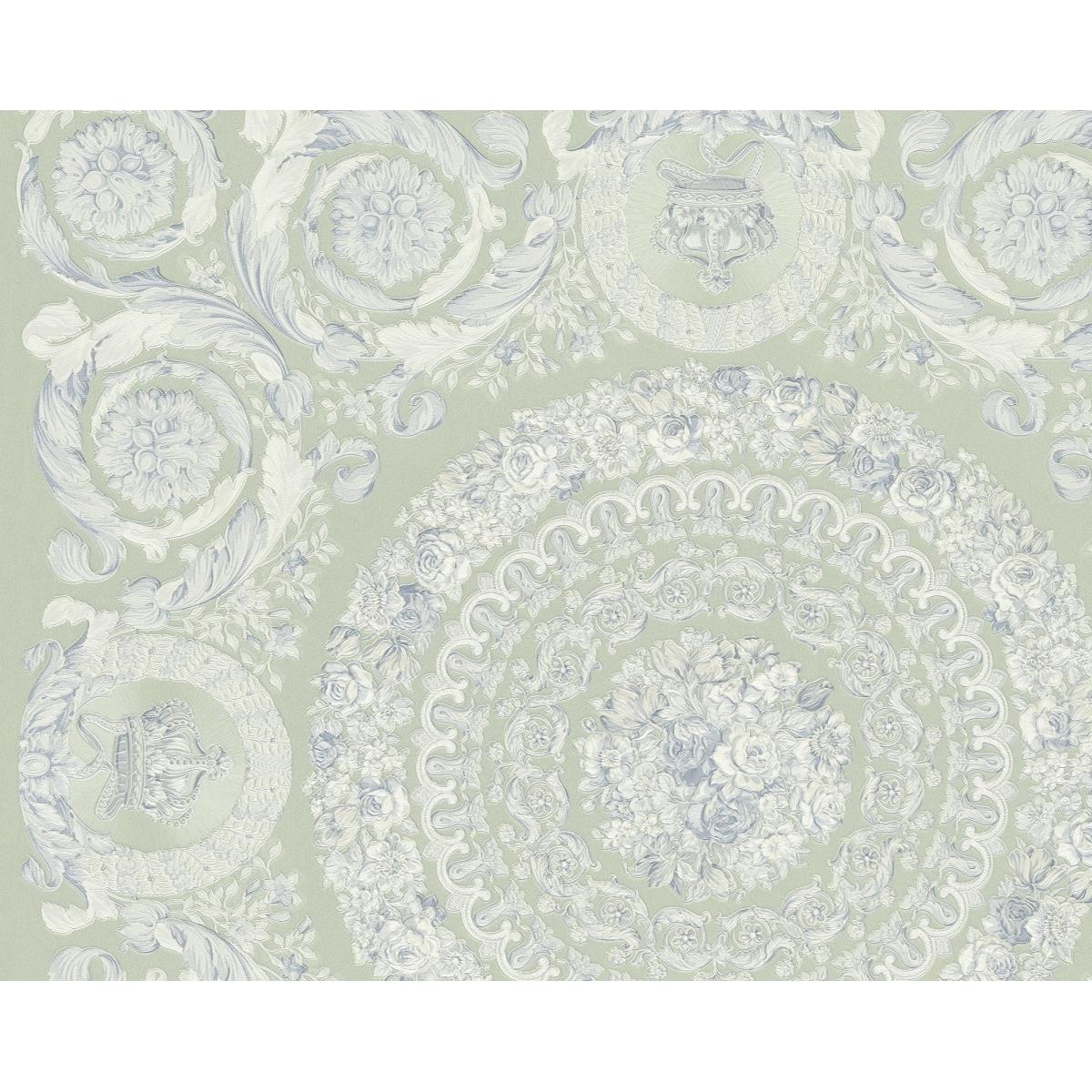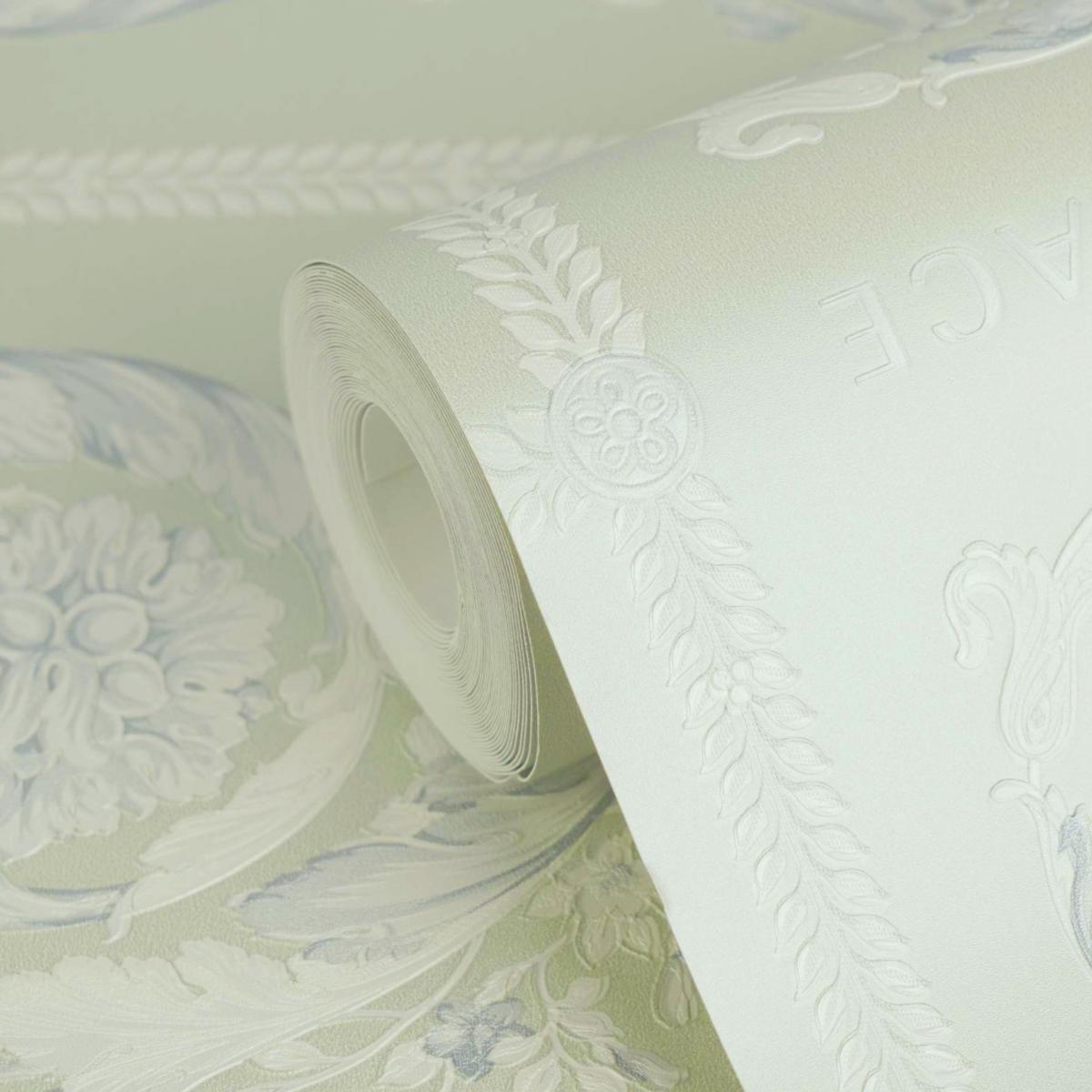 Versace Baroque classical heritage non woven designer wallpaper featuring elegant floral medallions and heritage scroll motifs inspired by classical European interiors. This refined wall covering showcases ornate baroque detailing. Premium embossed texture creates depth and luxury. Sophisticated versace wallpaper with pastel green and cream tones. Crafted with durable non-woven backing for easy installation. Perfect for luxury living rooms, bedrooms, and refined interiors.
