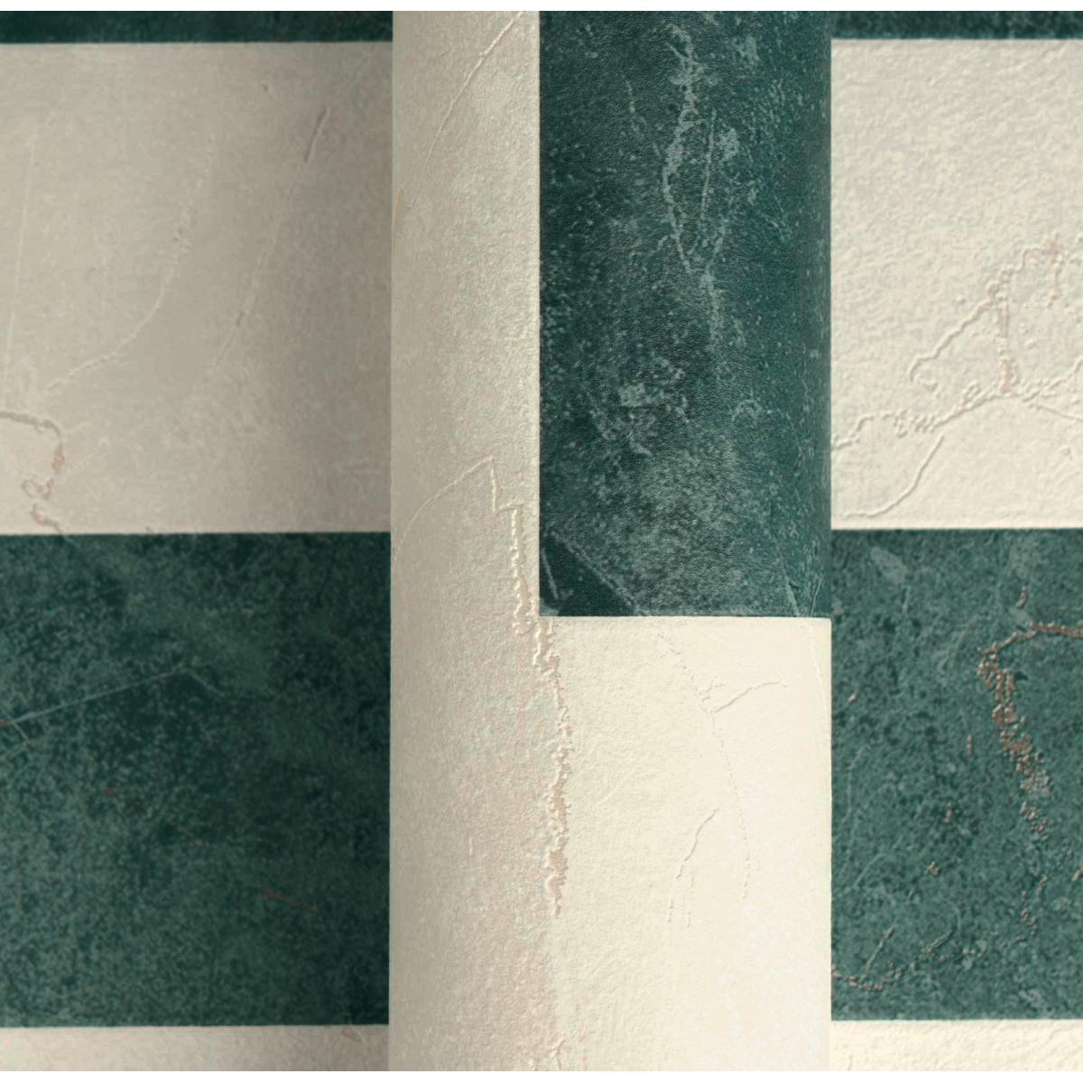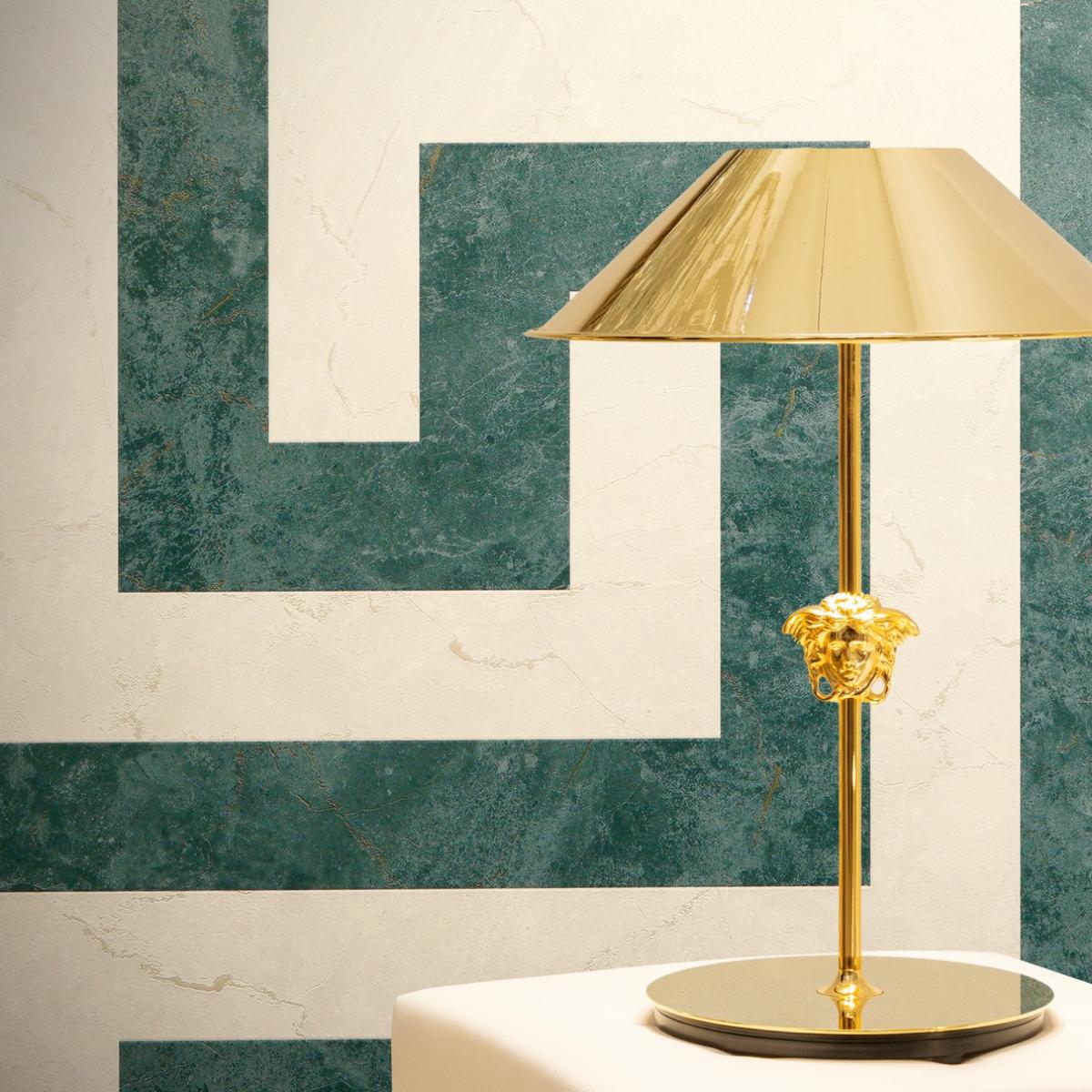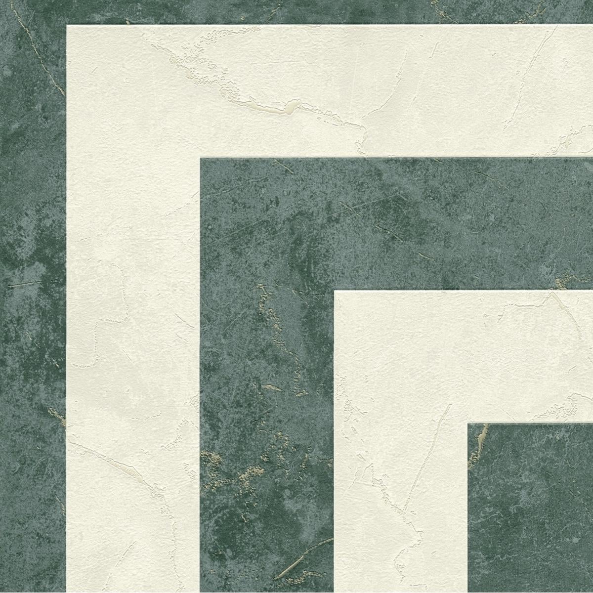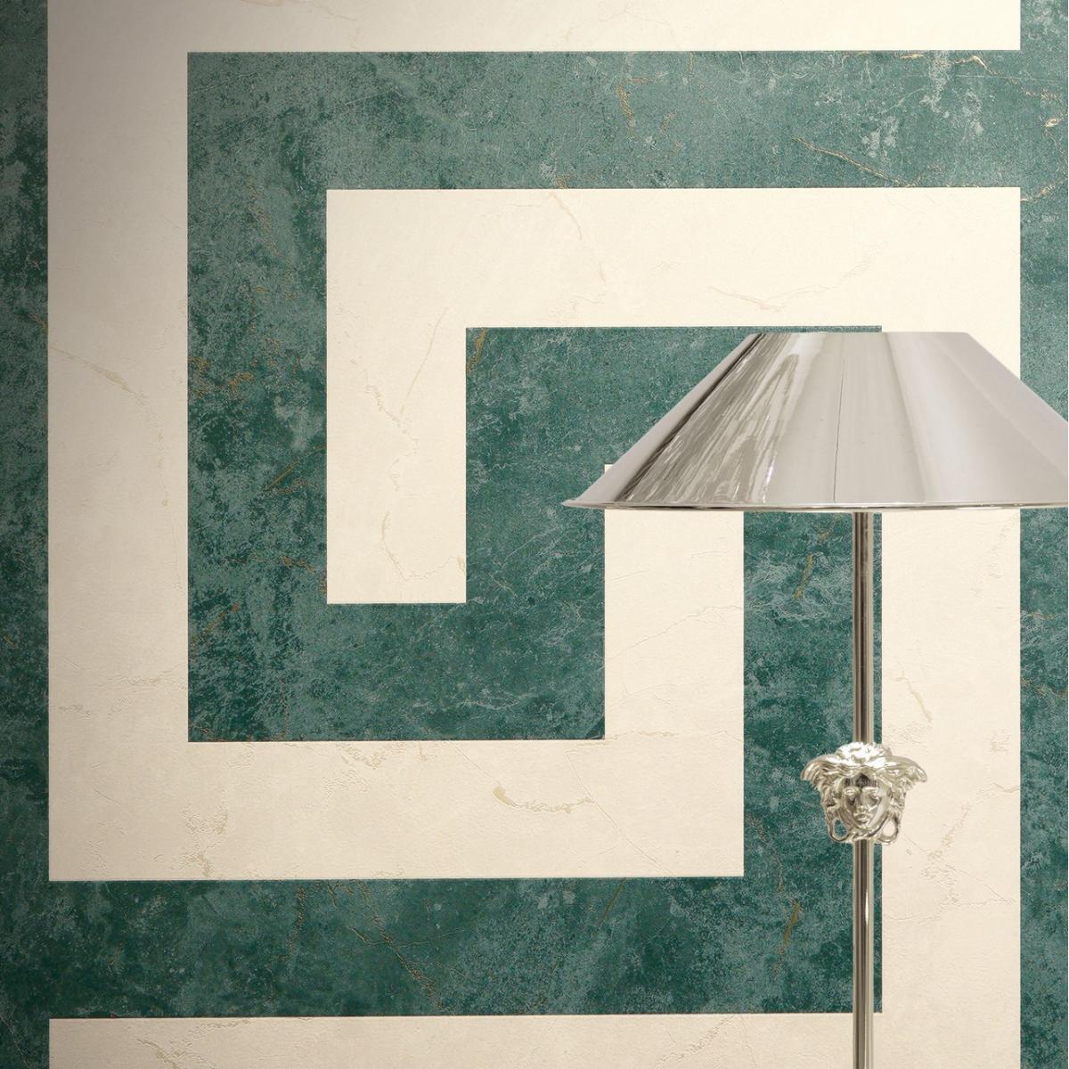Versace Greek Key Pattern modern wallpaper in green & cream features an elegant geometric Greek Key pattern in a sophisticated color palette. This luxury wallpaper is perfect for creating a bold yet refined atmosphere in high-end European homes and boutique commercial spaces, ideal for feature walls.