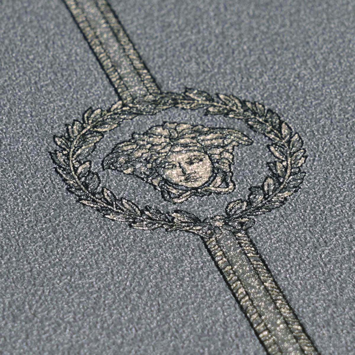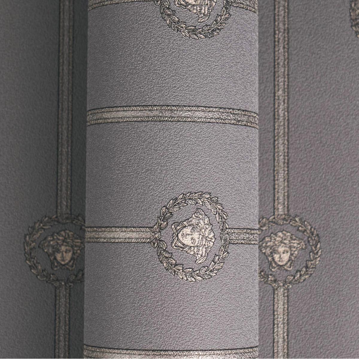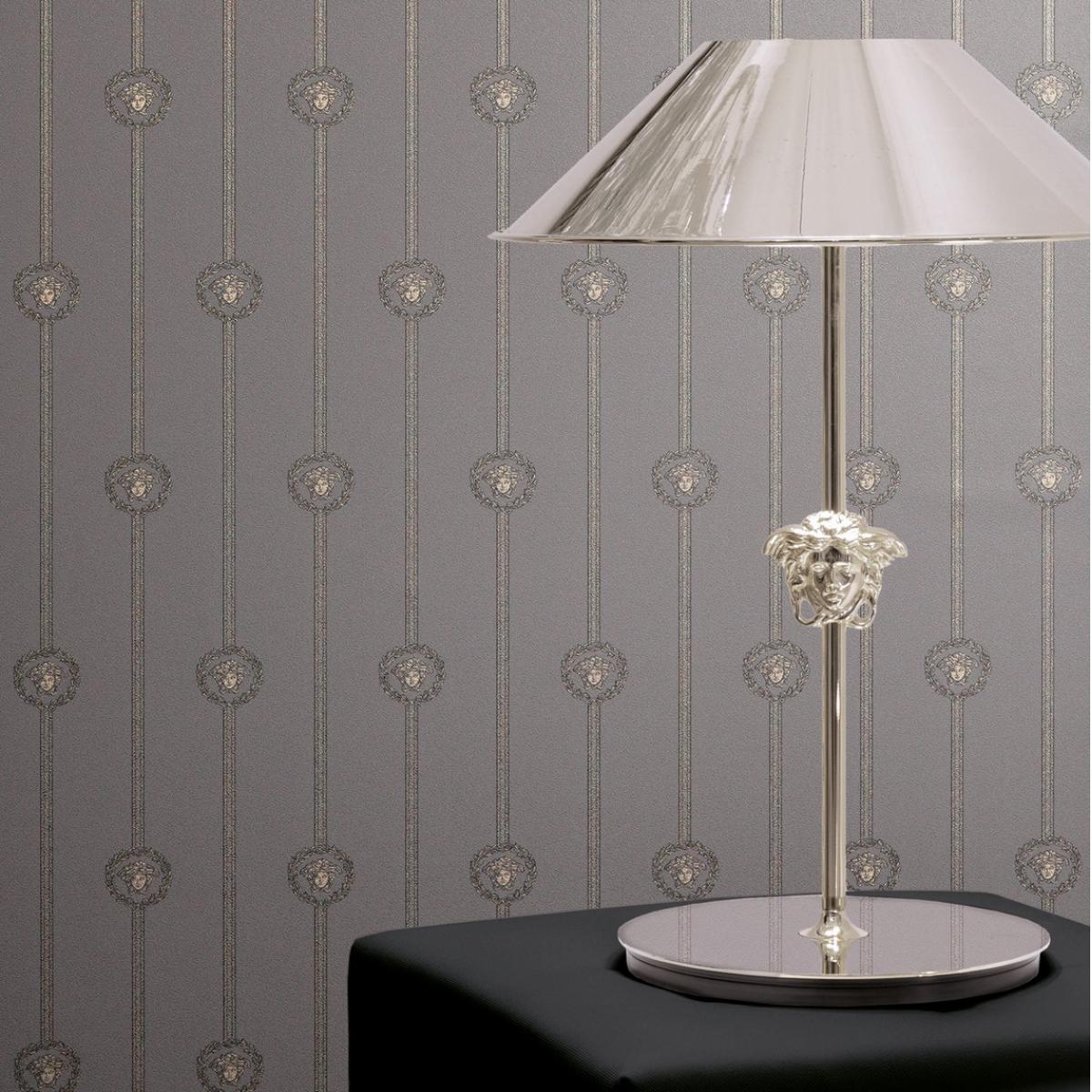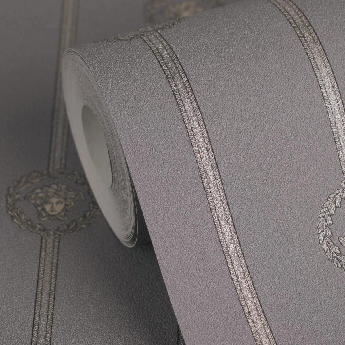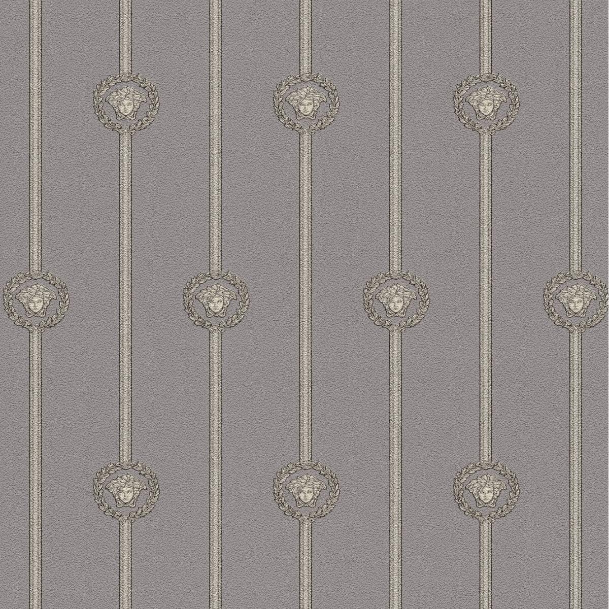 • Elegant Versace Grey Golden Medusa Striped Baroque NonWoven Designer Wallpaper with iconic Medusa emblem