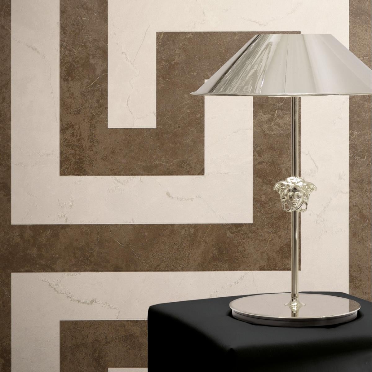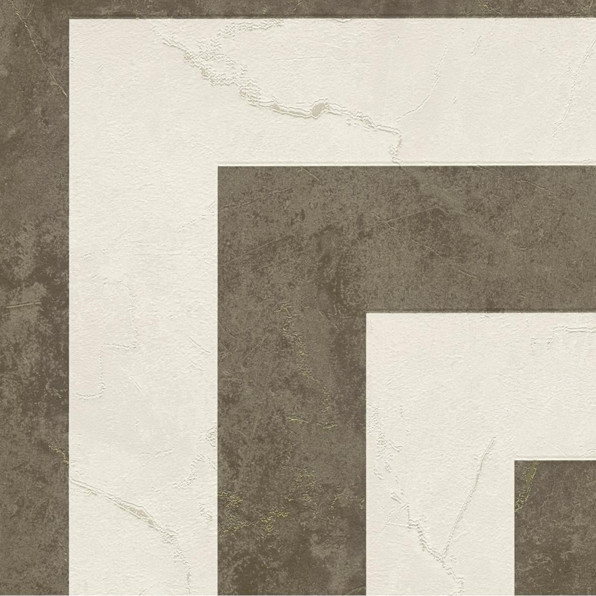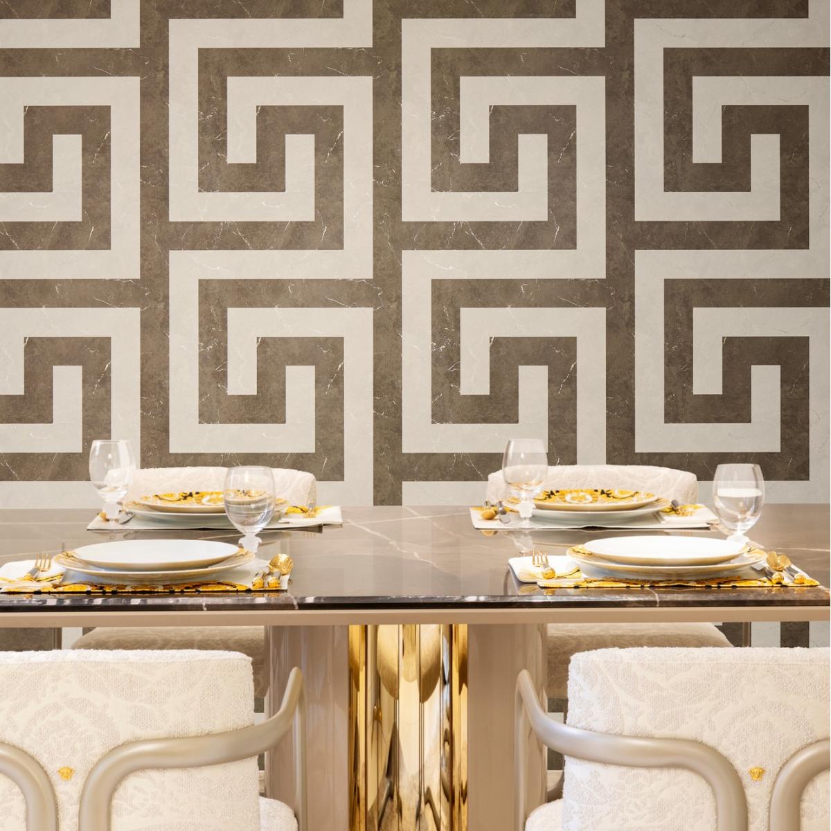 Versace Greek key graphics design modern wallpaper in deep brown & off-white offers a refined geometric pattern that blends sophistication with bold design. This luxury designer wallpaper is perfect for upscale interiors, providing a timeless and elegant aesthetic to high-end living spaces.