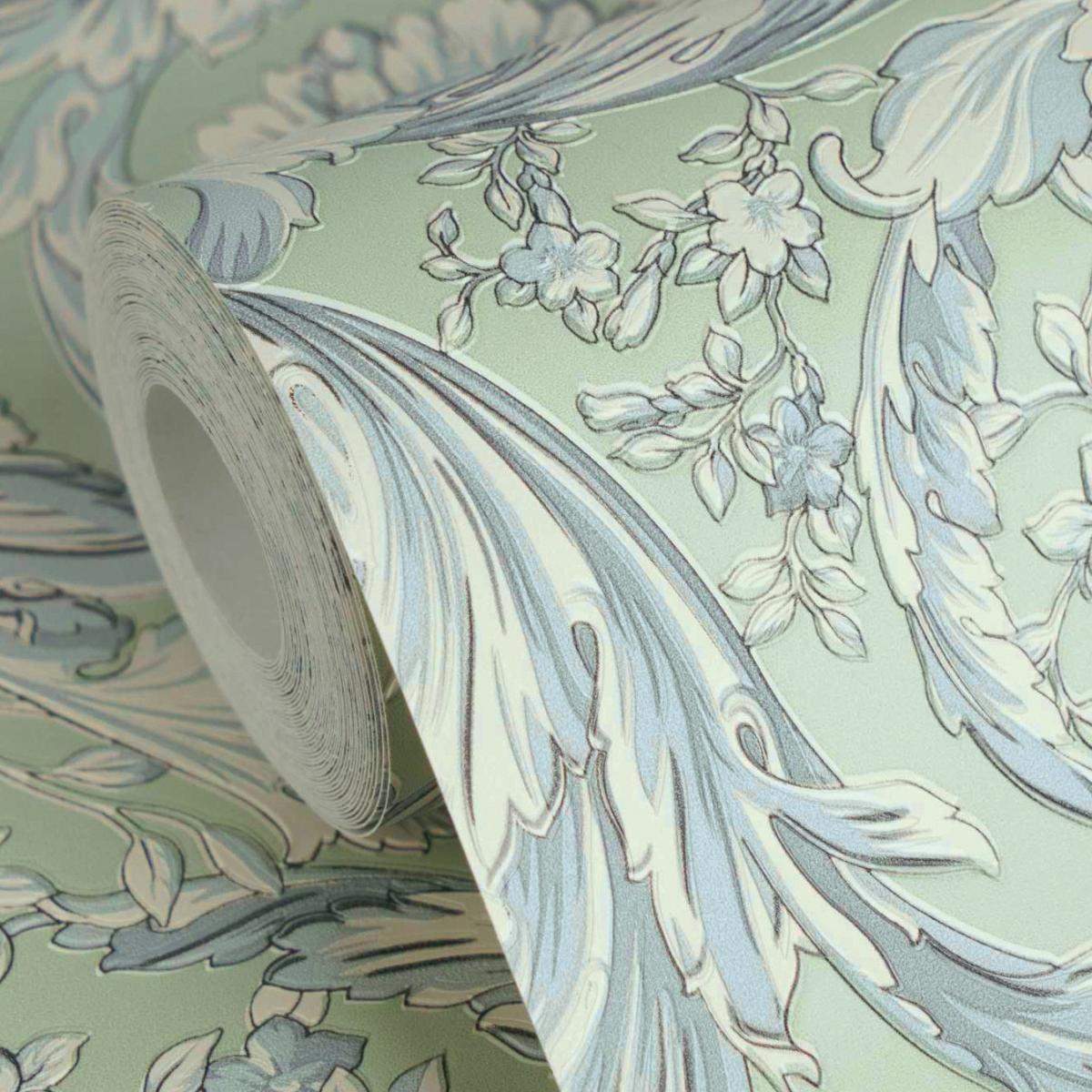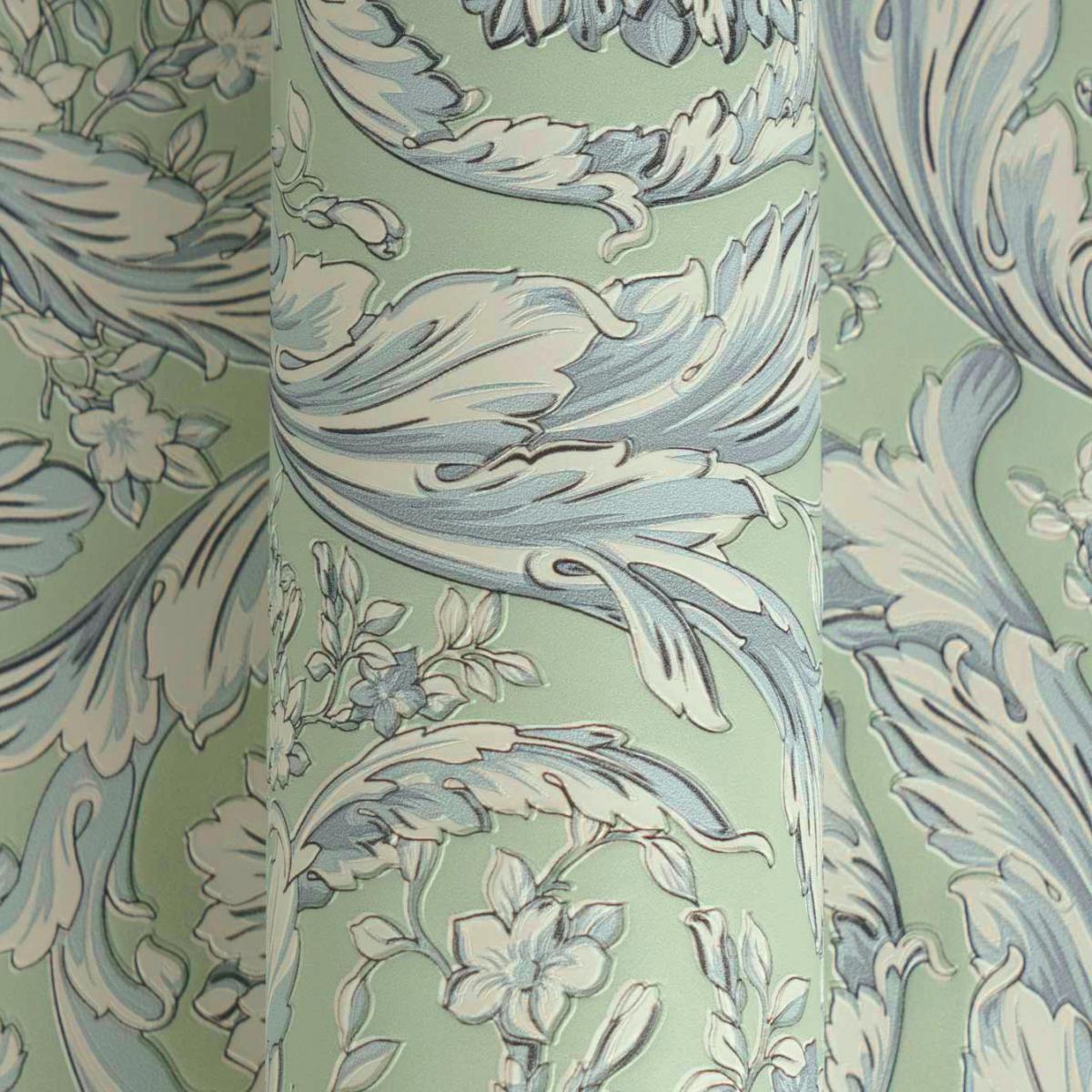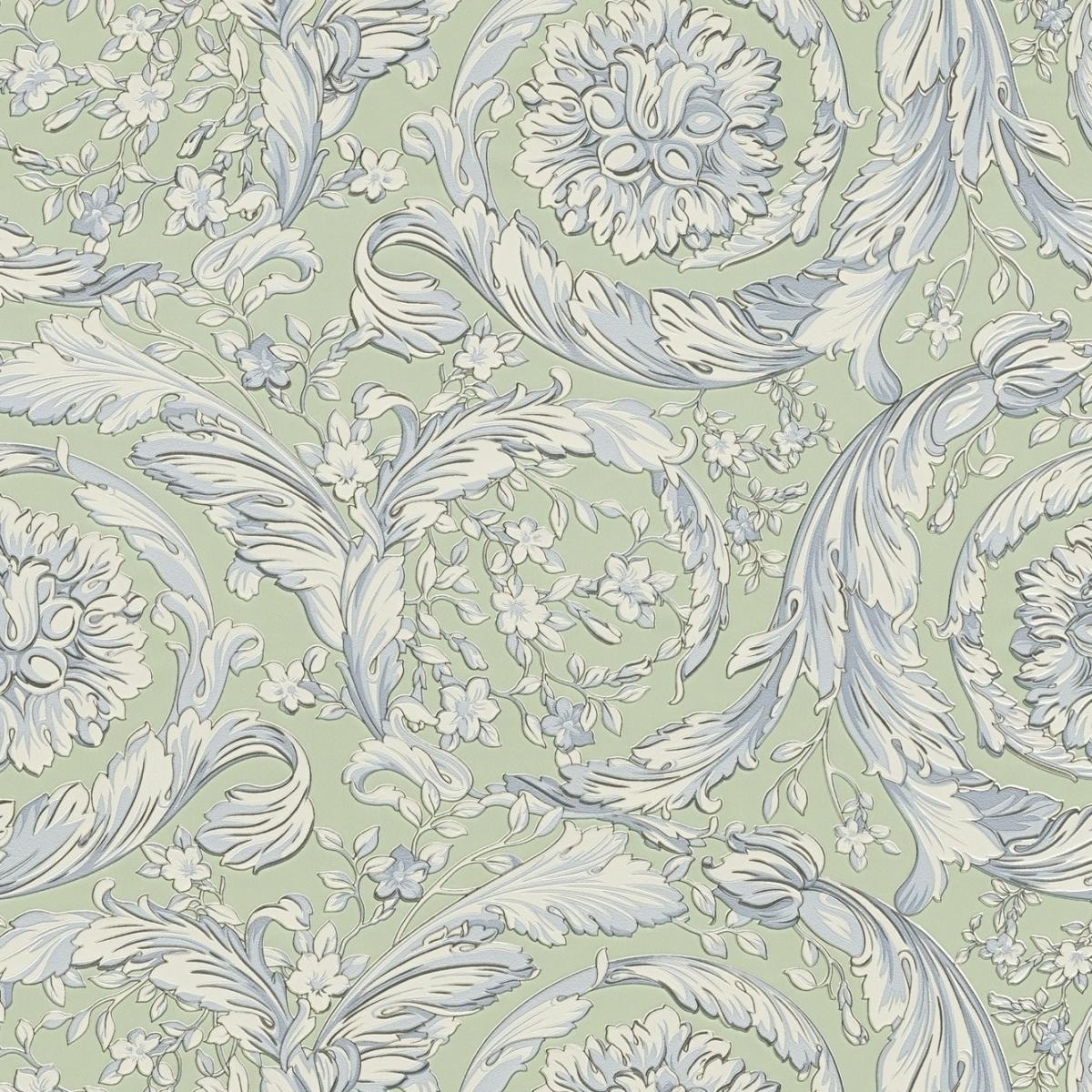 • versace luxury pastel green & sky floral leaf motif wallpaper featuring elegant Baroque botanical scrollwork and soft pastel colour palette