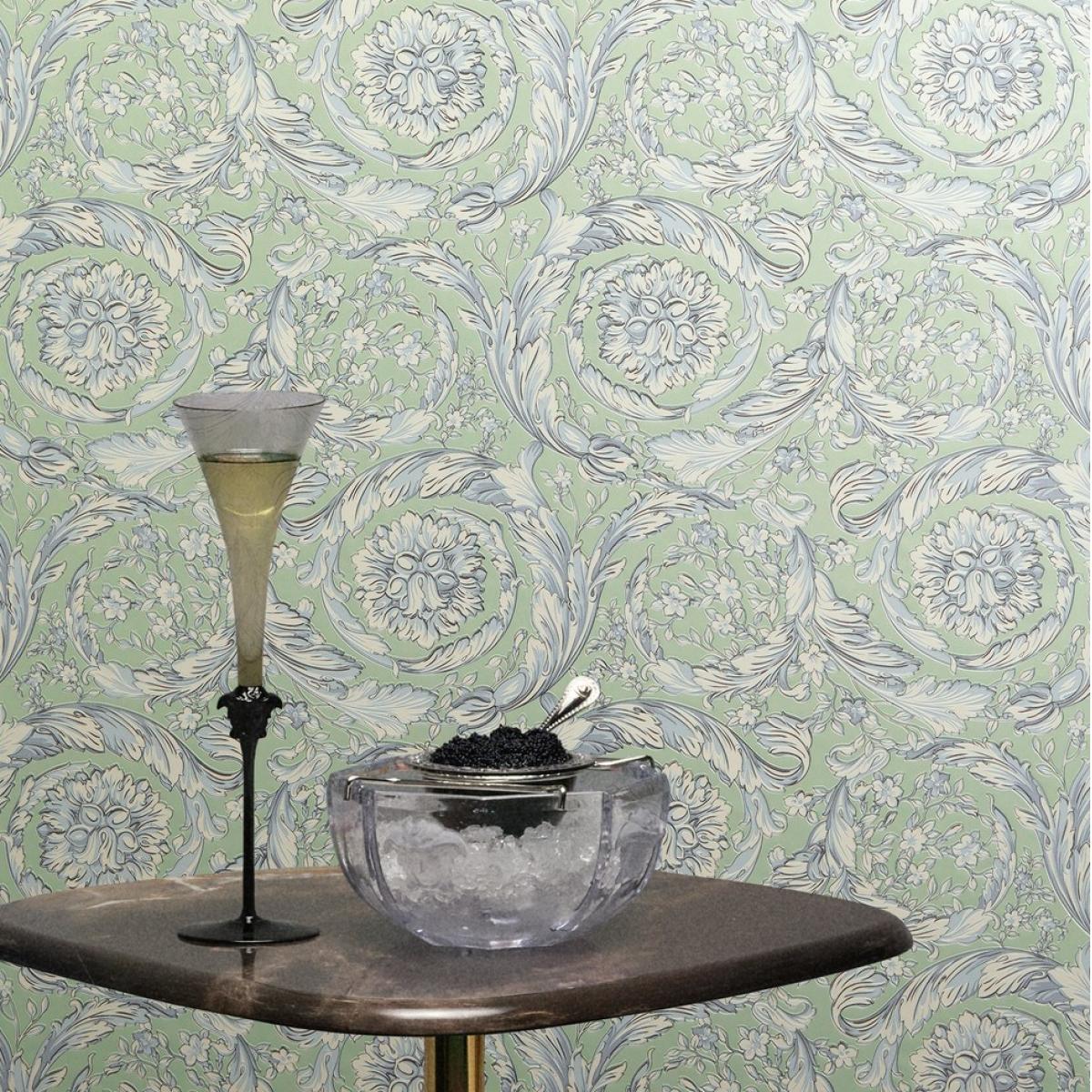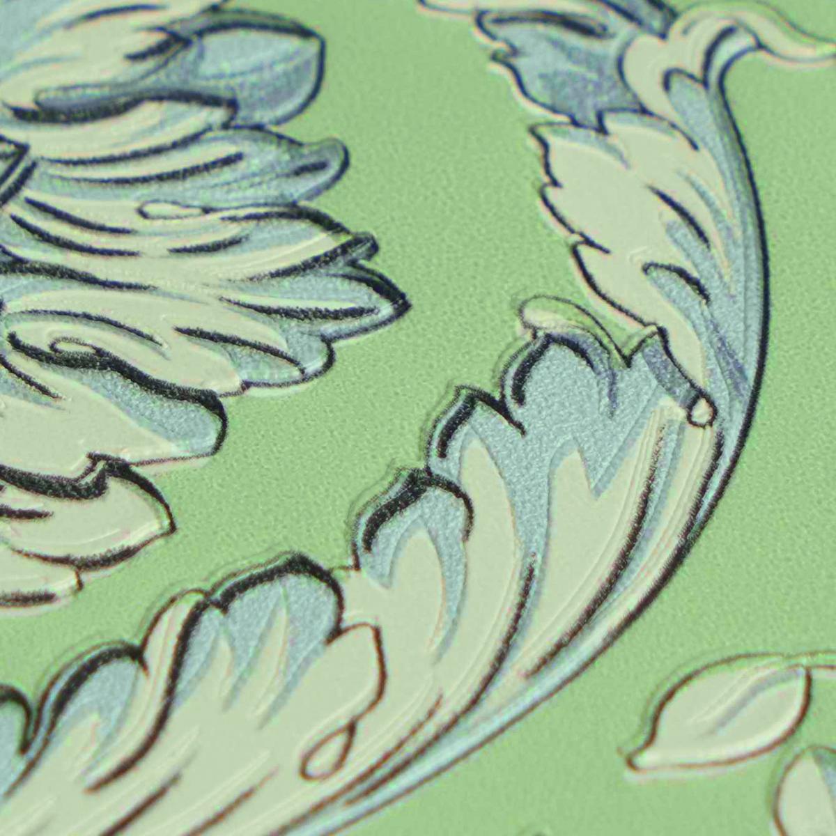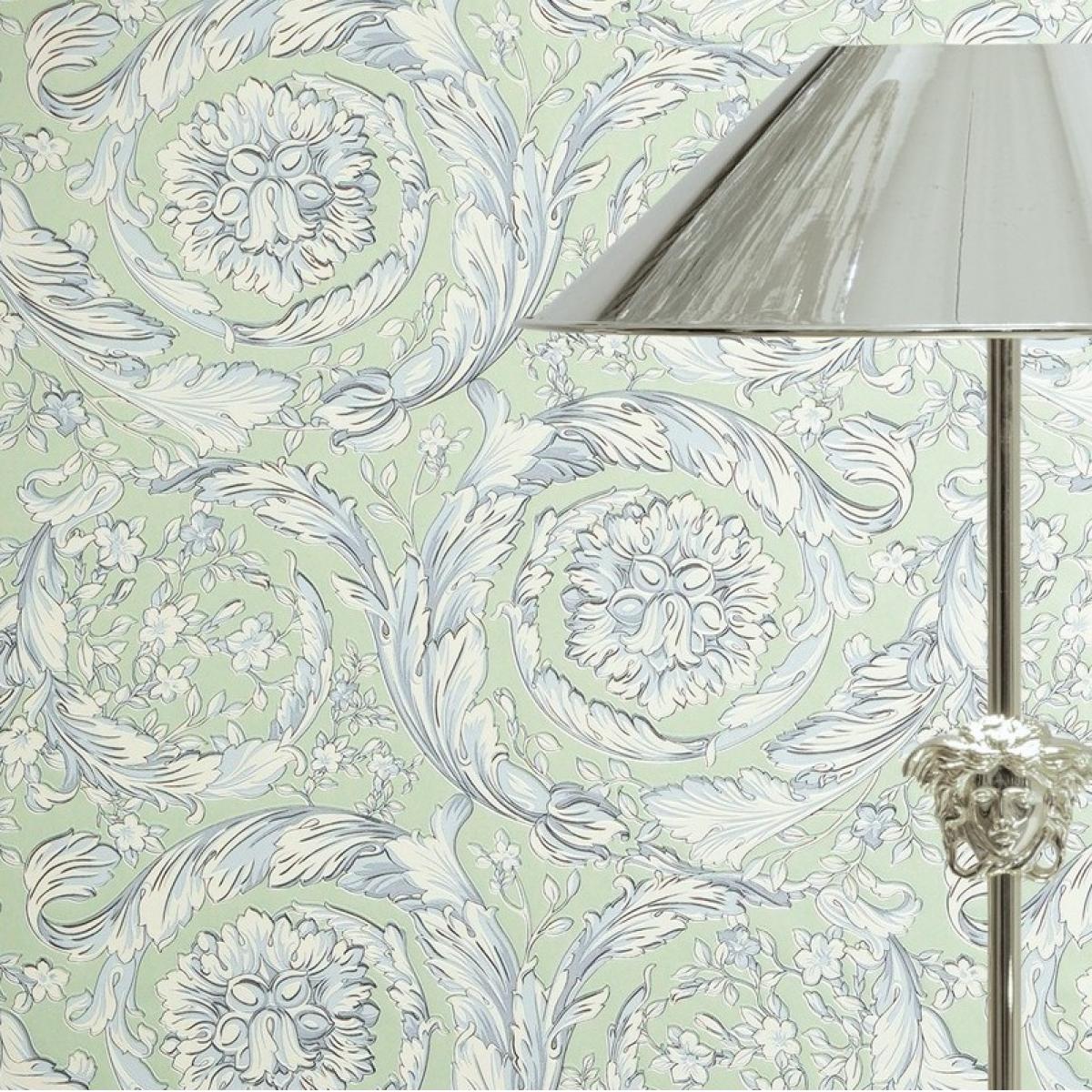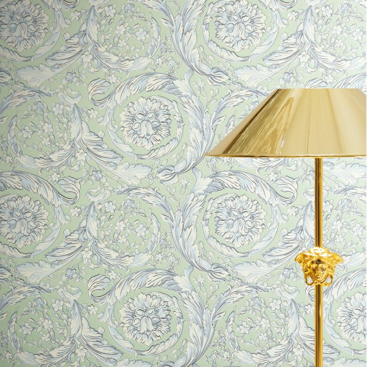 • versace luxury pastel green & sky floral leaf motif wallpaper featuring elegant Baroque botanical scrollwork and soft pastel colour palette