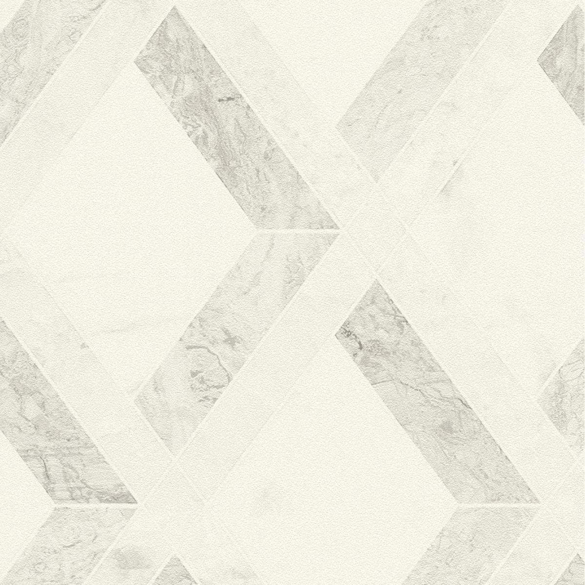 Versace White Grey Tarsia Design Modern Wallpaper combines elegant geometric diamond patterns with a marble effect in soft white and grey tones. This luxury wallpaper adds a sophisticated and contemporary touch to your living room, bedroom, or office.