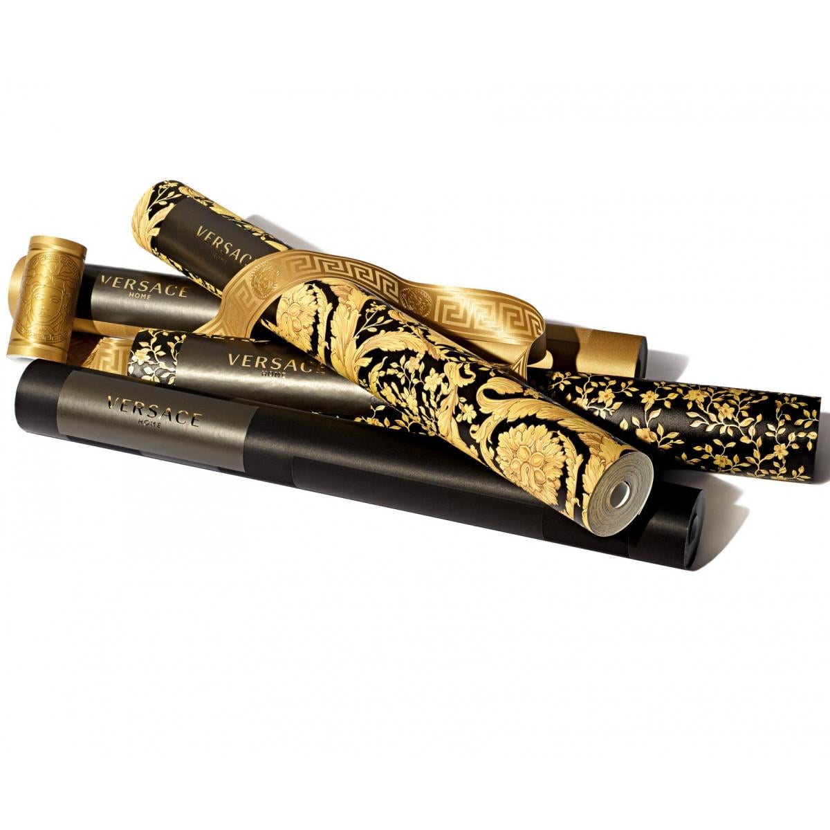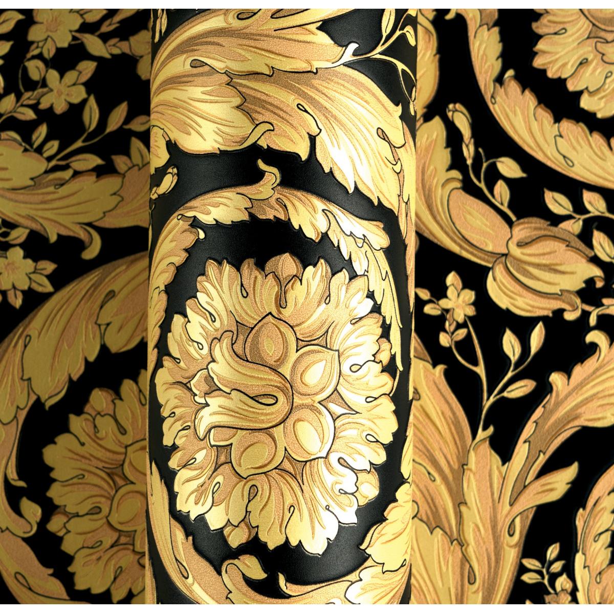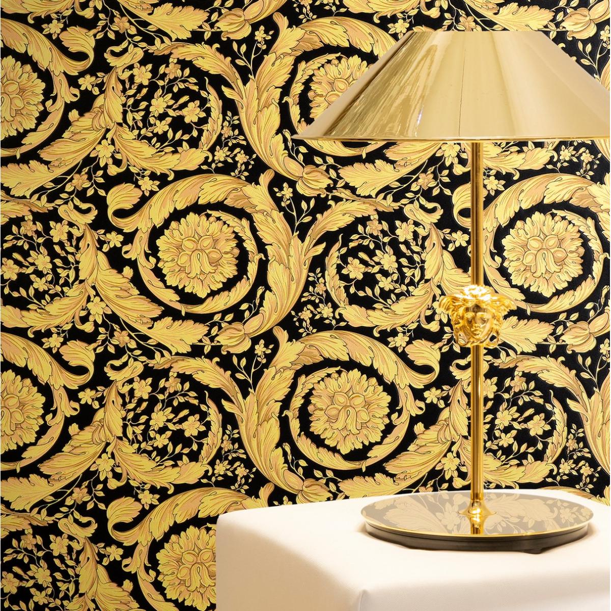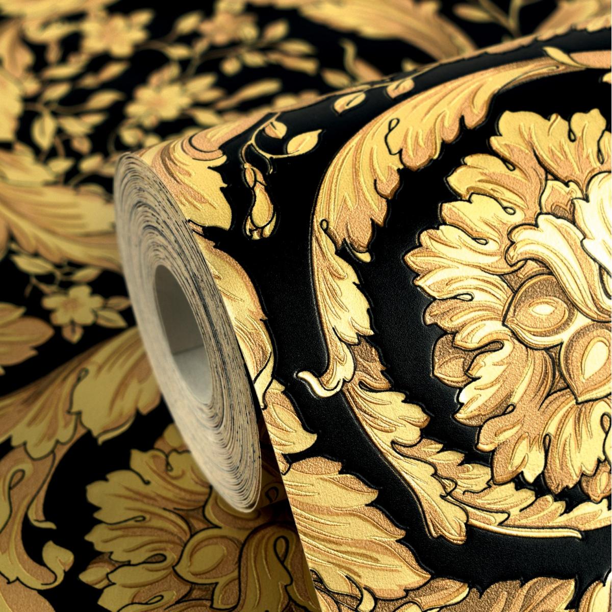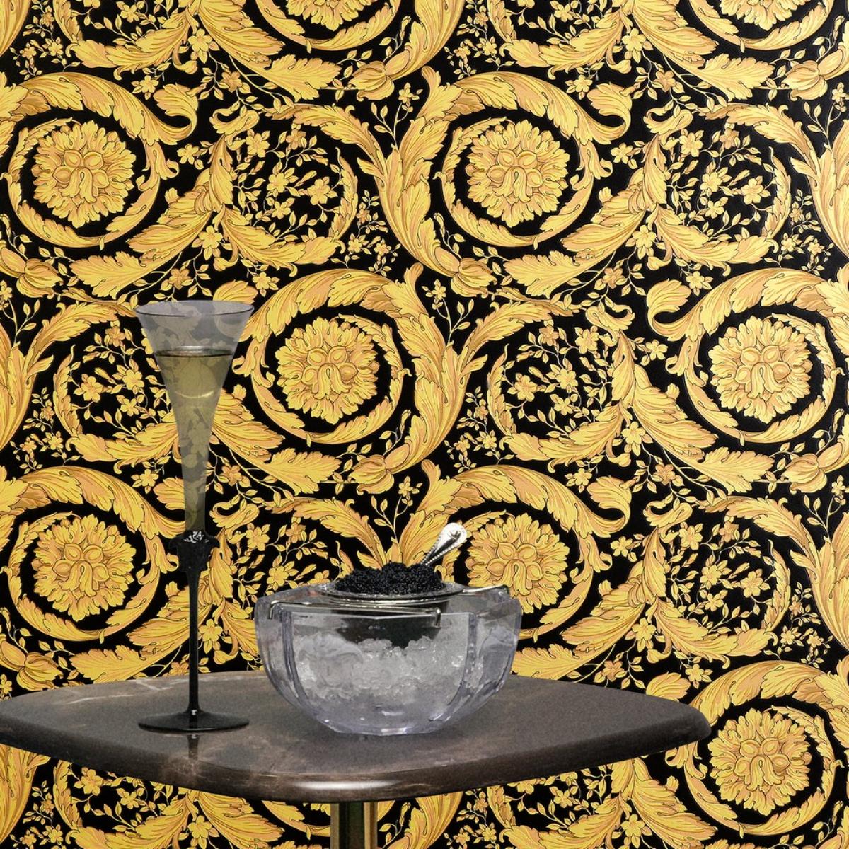 The Versace yellow gold & black floral butterfly motif baroque ornate designer wallpaper exudes grandeur and timeless elegance. The intricate gold floral and butterfly motifs are beautifully embossed against a deep black backdrop, giving the wallpaper a luxurious and captivating finish. This exquisite design, inspired by the baroque aesthetic, brings an air of sophistication and artistic charm to any space, making it perfect for creating a statement wall in high-end interiors.