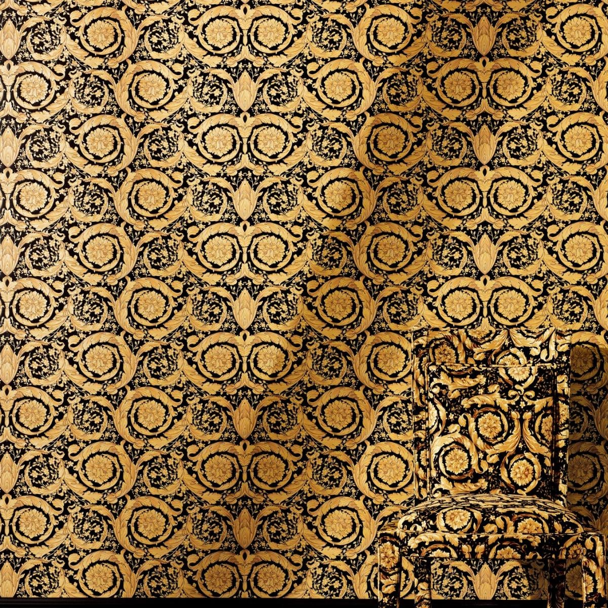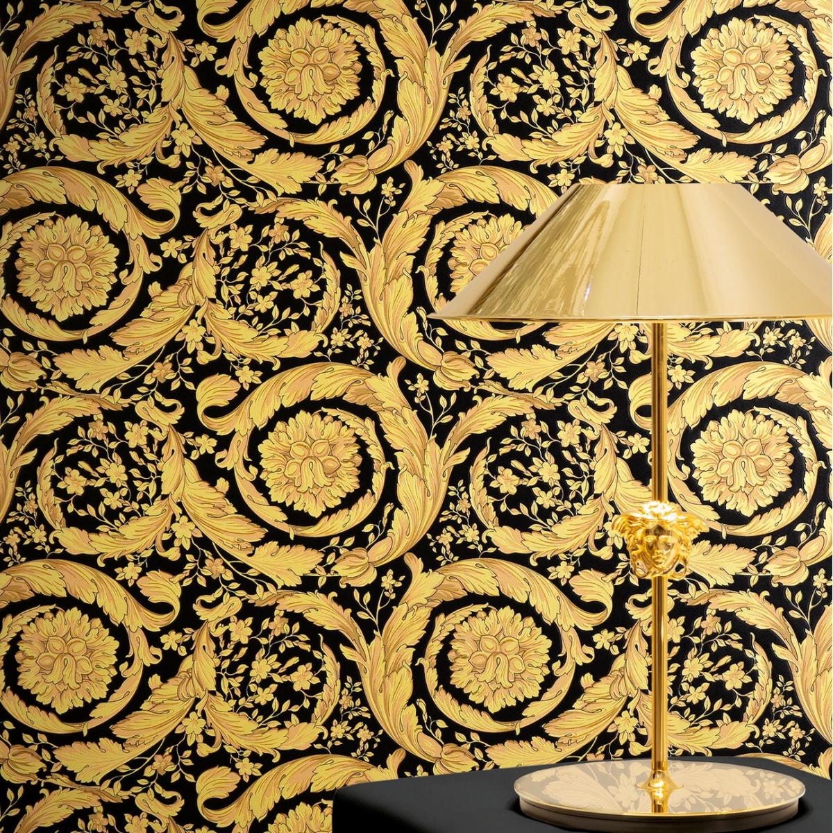 • Detailed versace wallpaper inspired by classic baroque motifs, ideal for grand living rooms, bedrooms, and elegant boutique hotel settings.