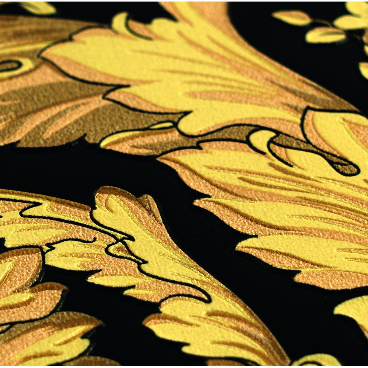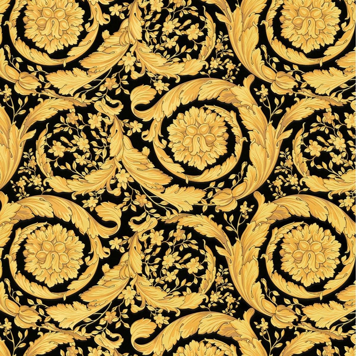 Versace Yellow Gold & Black Floral Butterfly Motif Baroque Ornate Designer Wallpaper by Luxury Group International