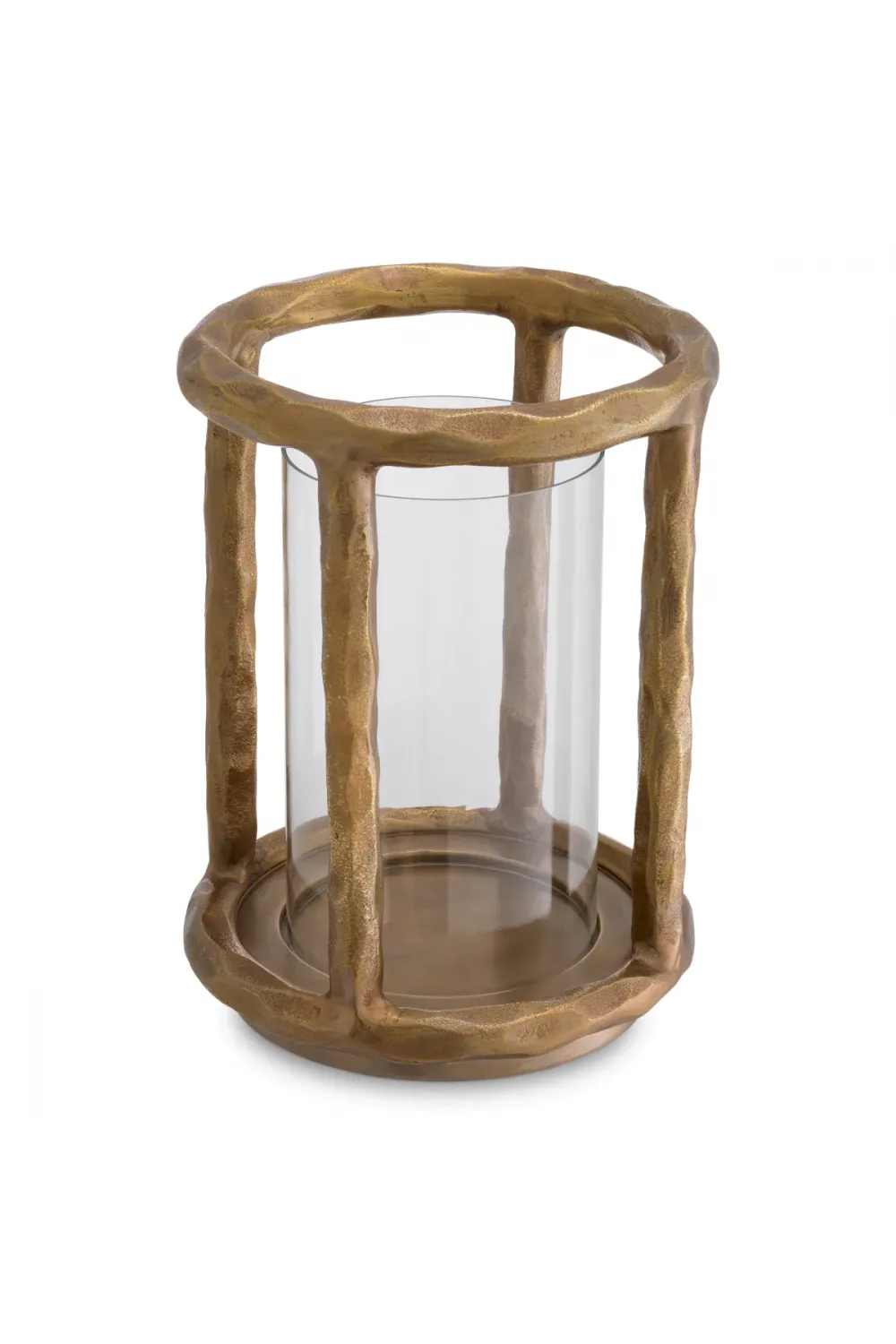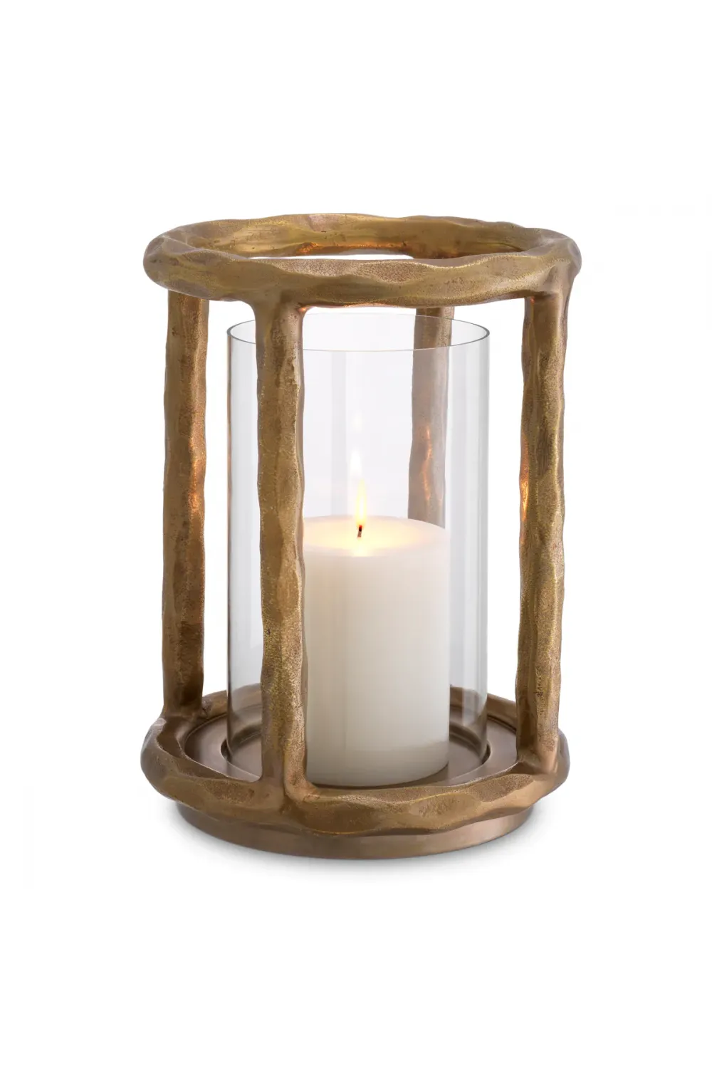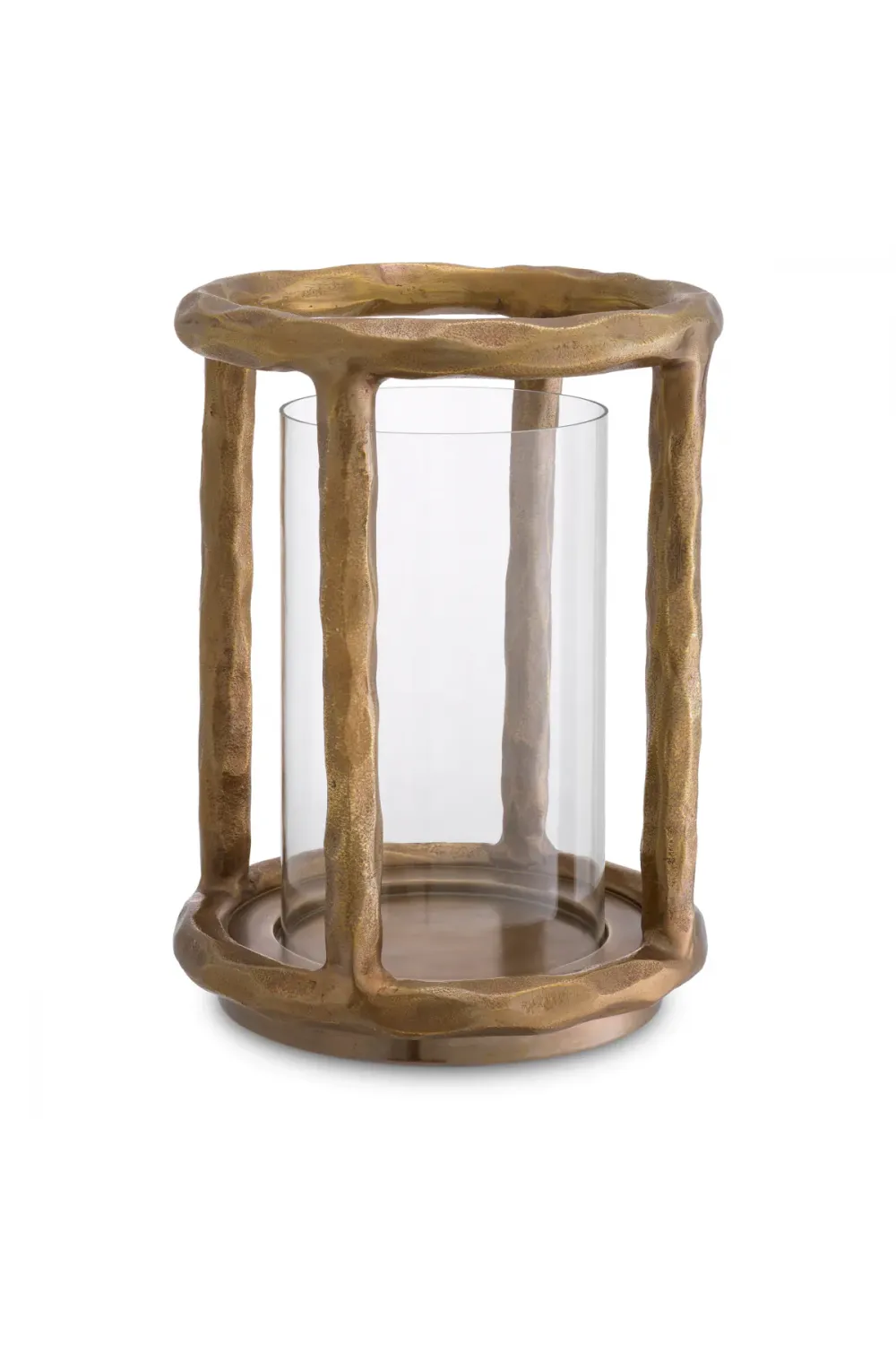 The Vintage Aurelia Hurricane captures the essence of classic elegance through its vintage brass finish and subtle hammered texture, evoking the warm glow of traditional European craftsmanship. The clear glass cylinder allows the candlelight to dance beautifully, casting gentle reflections that enrich any interior with a sense of calm and sophistication.