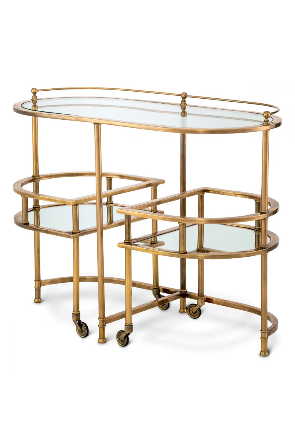 A timeless serving trolley featuring a vintage brass finish paired with mirrored and clear glass surfaces. Stylish, expandable, and effortlessly mobile — the perfect statement piece for sophisticated interiors.