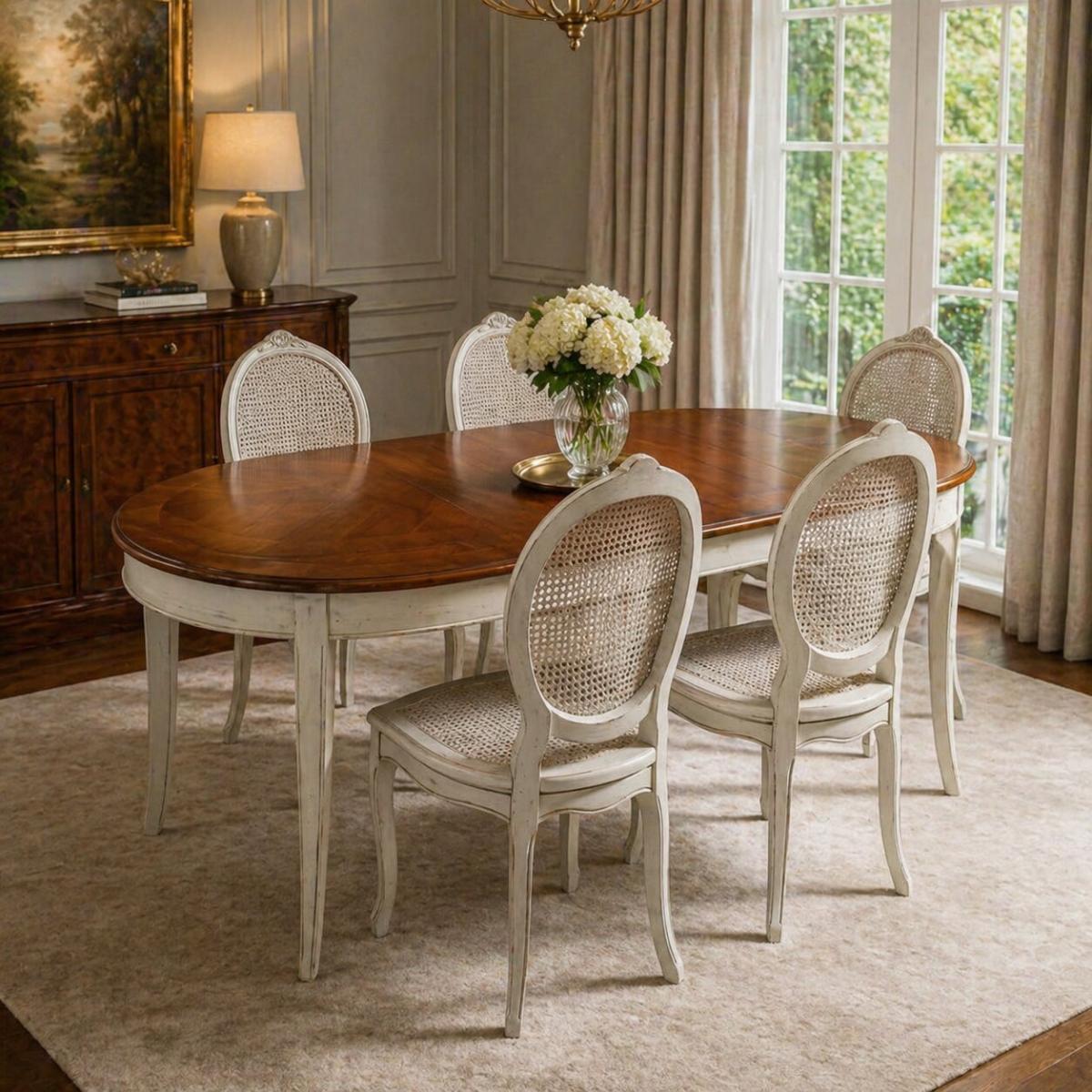 White Baroque Luxury Dining Room Set - 1 Oval Extendable Table & 6 Cane Back Chairs is a refined statement of European elegance, designed to elevate dining interiors with timeless sophistication. This luxury dining room set features a beautifully crafted oval table with a warm wooden marquetry-style top, complemented by a softly distressed white base. Paired with six elegantly sculpted chairs featuring cane back panels, the ensemble captures the graceful essence of a classic baroque dining room set, offering both visual lightness and artisanal charm.