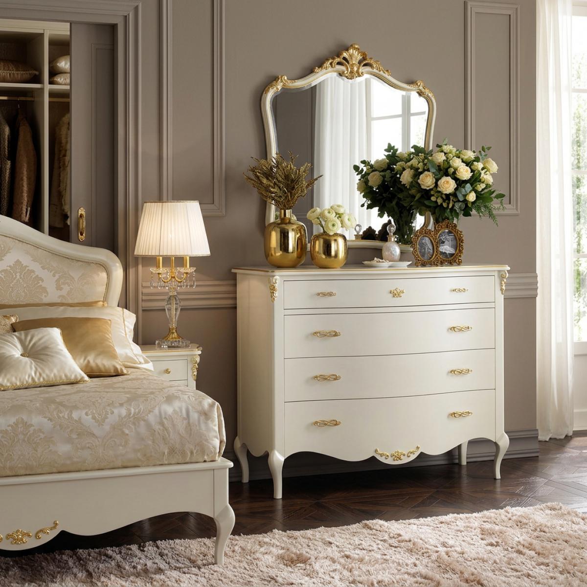 A refined luxury dresser in white finish with gold accents and multi drawer storage, designed to enhance luxury dressers for living room with timeless baroque elegance and functionality.