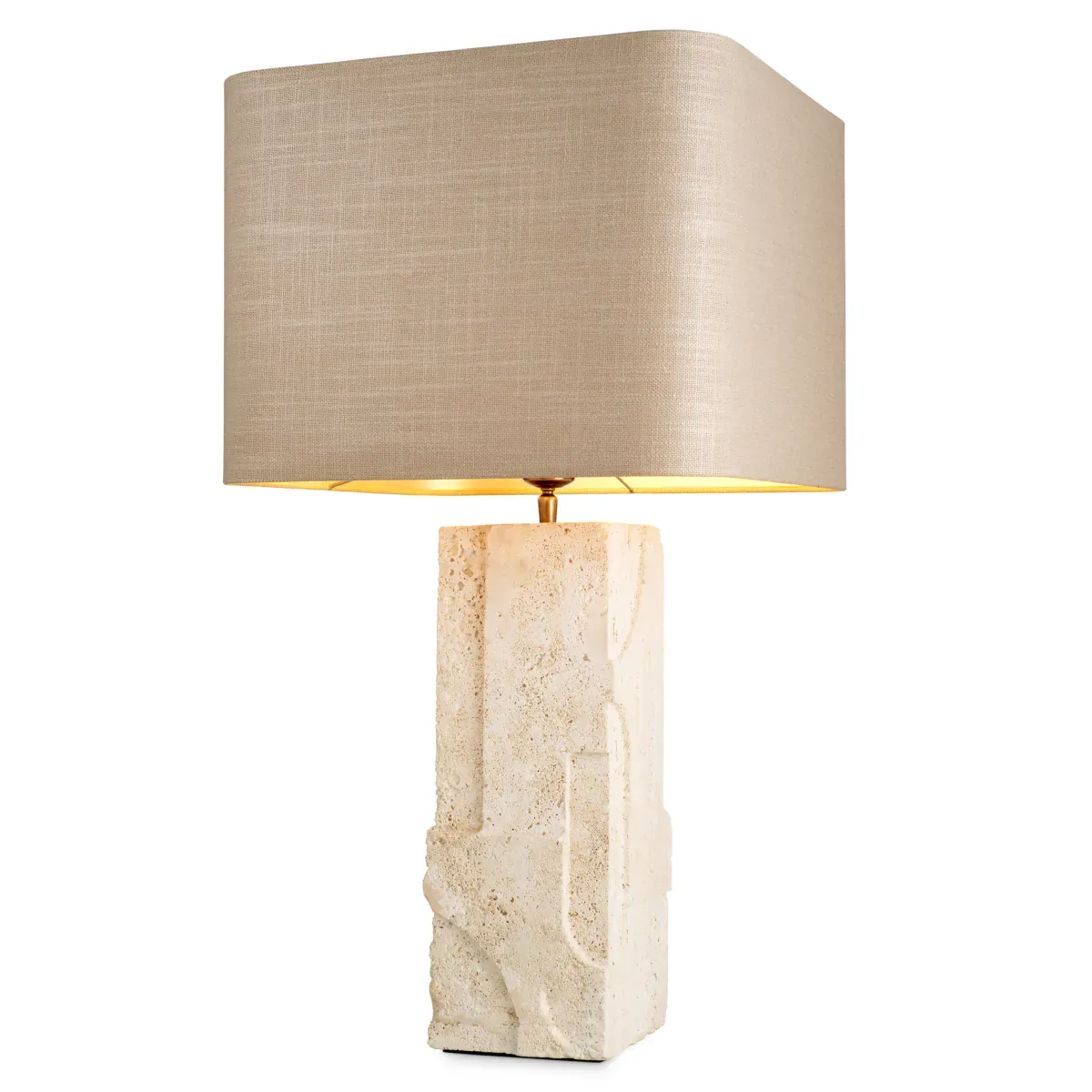 Perfect as a bedside companion or an ambience builder for the living room, this modern table lamp supports a relaxed atmosphere for winding down, reading, or hosting. The beige lampshade softens the light for a gentle, flattering effect that enhances textures and creates inviting depth. Embrace the captivating character of travertine-inspired design and enjoy how this lamp adds sophisticated warmth to any luxurious setting. Elevate your interior ambiance with our luxury table lamp collections, where timeless design and gentle illumination create a sophisticated and welcoming living space.