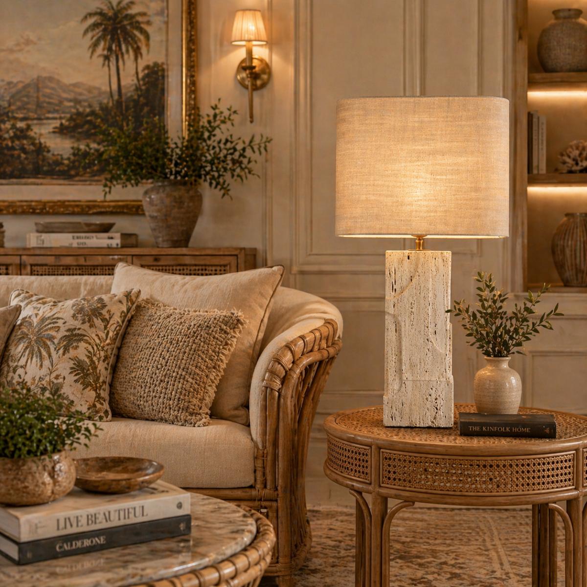 Crafted with an eye for tactile beauty, the lamp features a travertine-inspired speckled stone column base that showcases natural variations in color and texture. This gives each piece a subtle individuality, so your lighting feels distinctly yours rather than mass-produced. The neutral tones make it simple to style alongside wood, stone, linen, and warm metallic finishes, while the overall look stays elegant and timeless. Refine your space with our luxury lighting collections, where elegant design and ambient illumination come together to create a truly sophisticated atmosphere.