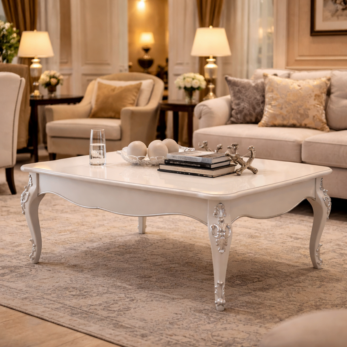 An embodiment of luminous European elegance, this luxury coffee table mesmerises with its pristine white finish and lavishly hand-applied silver ornate sculpted legs in the grandest baroque coffee table tradition — a refined wooden coffee table of sweeping cabriole form that brings effortless classical grace and quiet opulence to any distinguished living room.