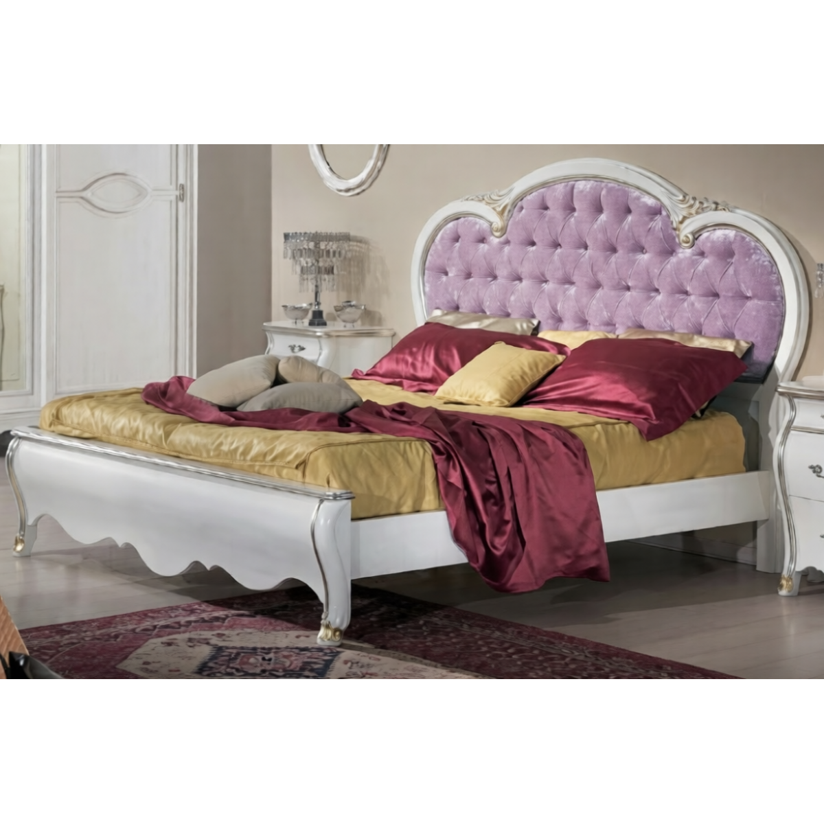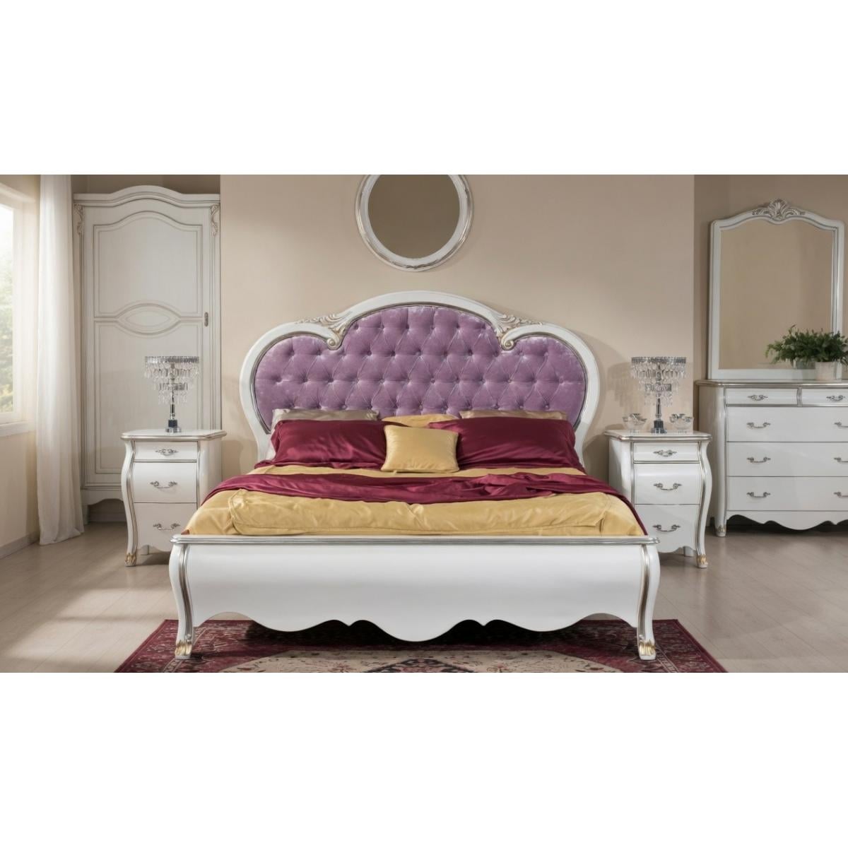 Luxury White Lacquer Baroque Double Bed with Lilac Velvet Button-Tufted Headboard in Gold Accent — 212×220 CM introduces a refined chromatic sensibility to the European Baroque furniture tradition — one that distinguishes it immediately and memorably from the ivory and pearl compositions of its classical counterparts. The frame is hand-constructed from premium dense solid hardwood, its structure shaped by skilled European artisans into the fluid, organic curves of the Rococo vocabulary. The headboard assumes a gracefully rounded oval-arch form — more contained and feminine in its proportions than the dramatically widened silhouettes of comparable Baroque pieces — yet no less commanding in its overall presence. Its upholstered panel is covered in a sumptuous soft lilac velvet of notable depth and tactile quality, hand-tufted in a deep-button diamond formation that draws the fabric into a richly textured surface of extraordinary visual softness. The carved headboard surround is finished in gloss white lacquer with silver leaf highlighting along every carved ridge and profile edge, terminating at the crown in a pair of delicate scroll flourishes that frame the composition with characteristic Rococo refinement. The footboard presents a clean scalloped base rail in gloss white lacquer with silver leaf edge detailing — restrained in its ornamentation to allow the headboard its full decorative authority. The sweeping cabriole legs are among the most dramatically curved in the series — their white lacquer profiles highlighted in silver leaf with a selective gold leaf accent applied at each foot terminal, lending the base of the composition a warm, grounded counterpoint to the cooler silver tones above. This designer double bed, at a generous 212×220 CM, represents a rare convergence of classical Baroque structure and unexpected chromatic sophistication in European luxury furniture.