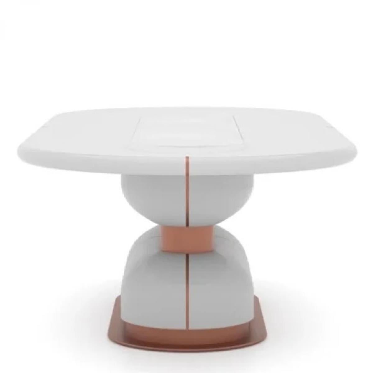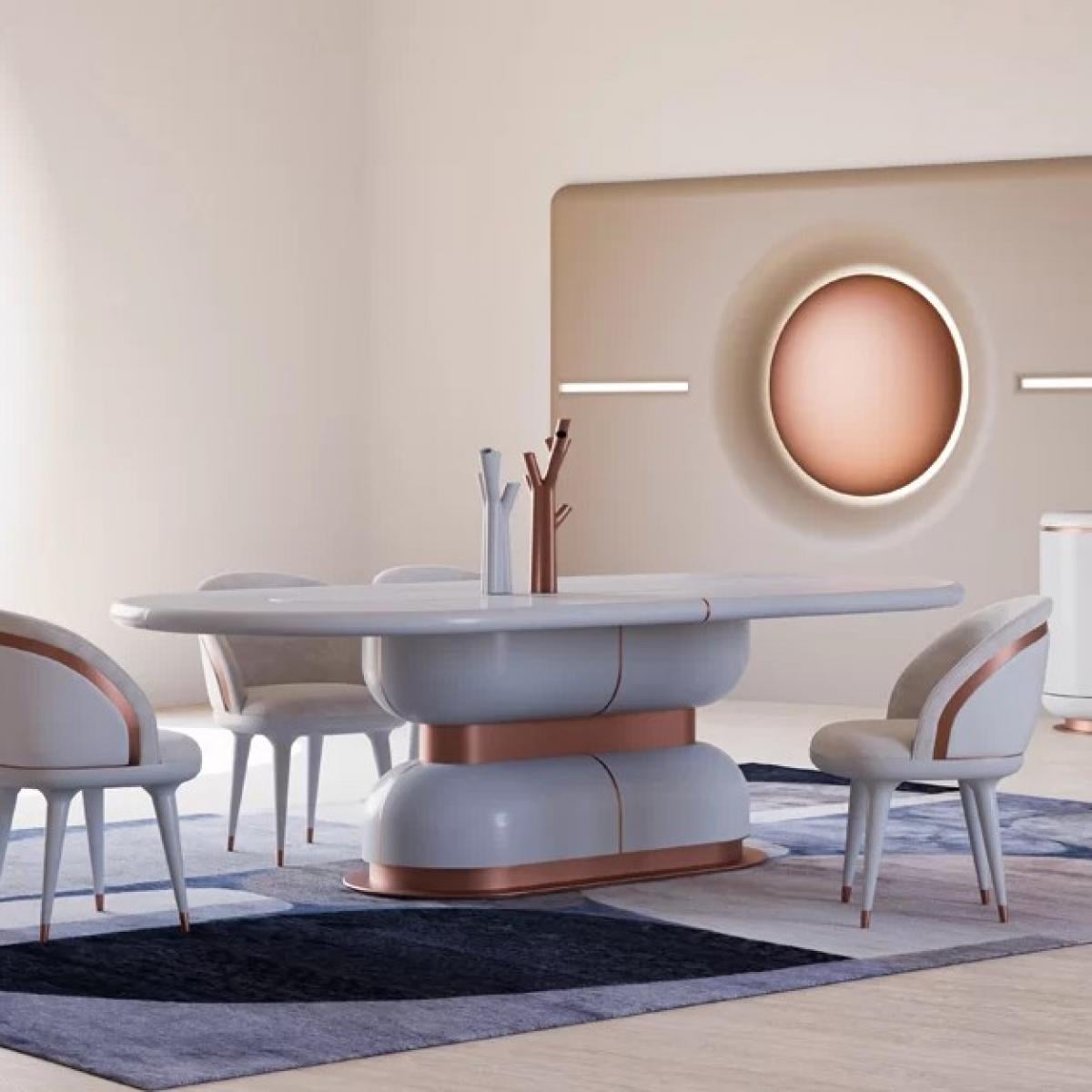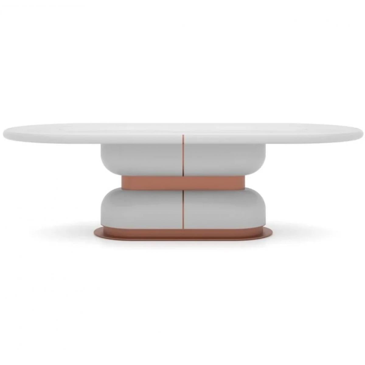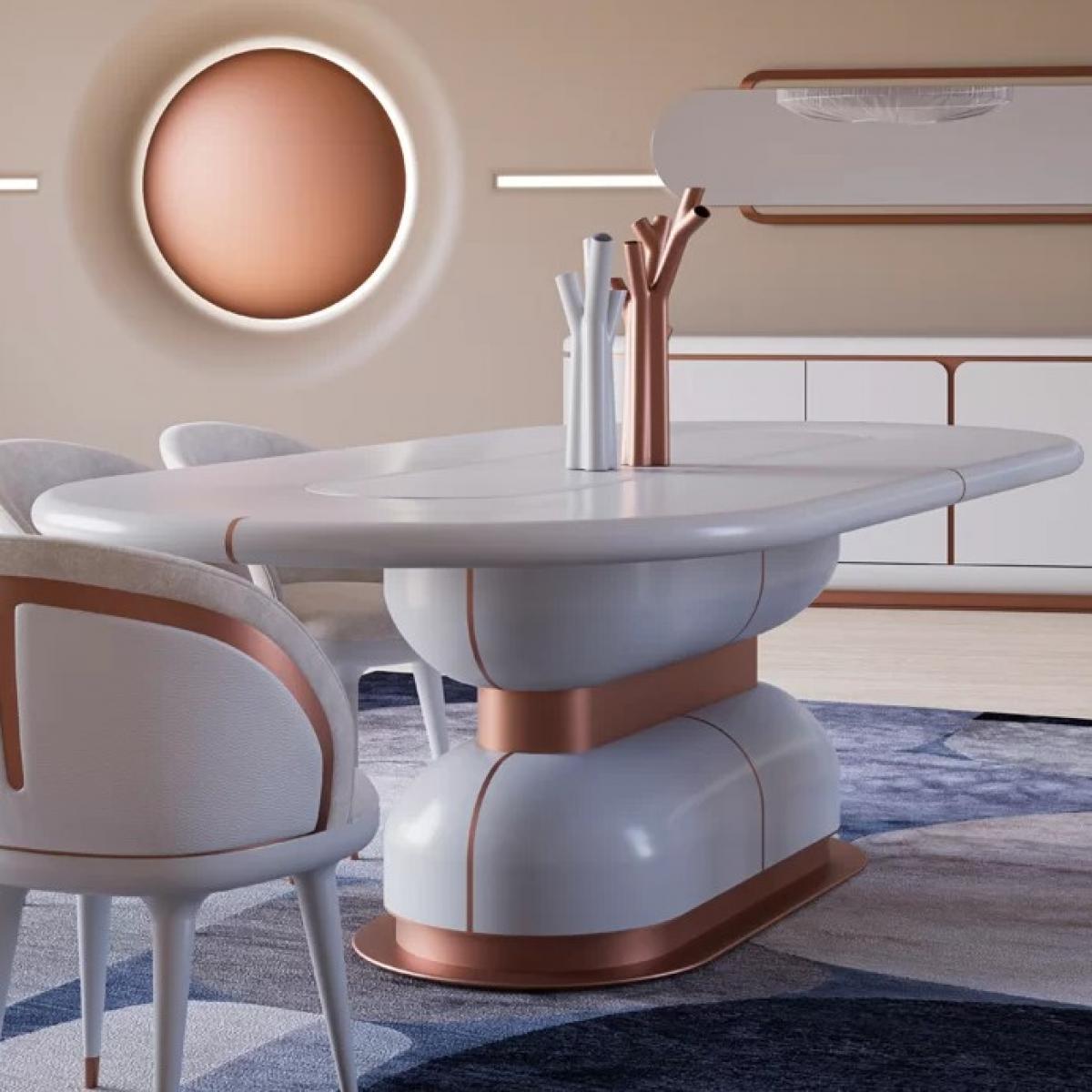 The White Marble Oval Top Luxury Dining Table with Copper Accents combines a sleek, marble tabletop with a modern copper finish base. Perfect for contemporary interiors, this luxury dining table elevates any space with its sophisticated design and elegant contrasts.