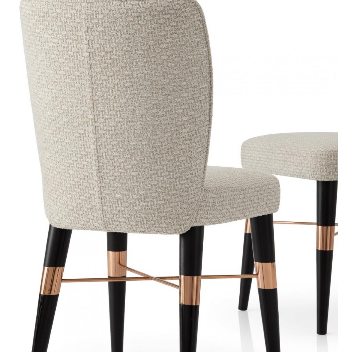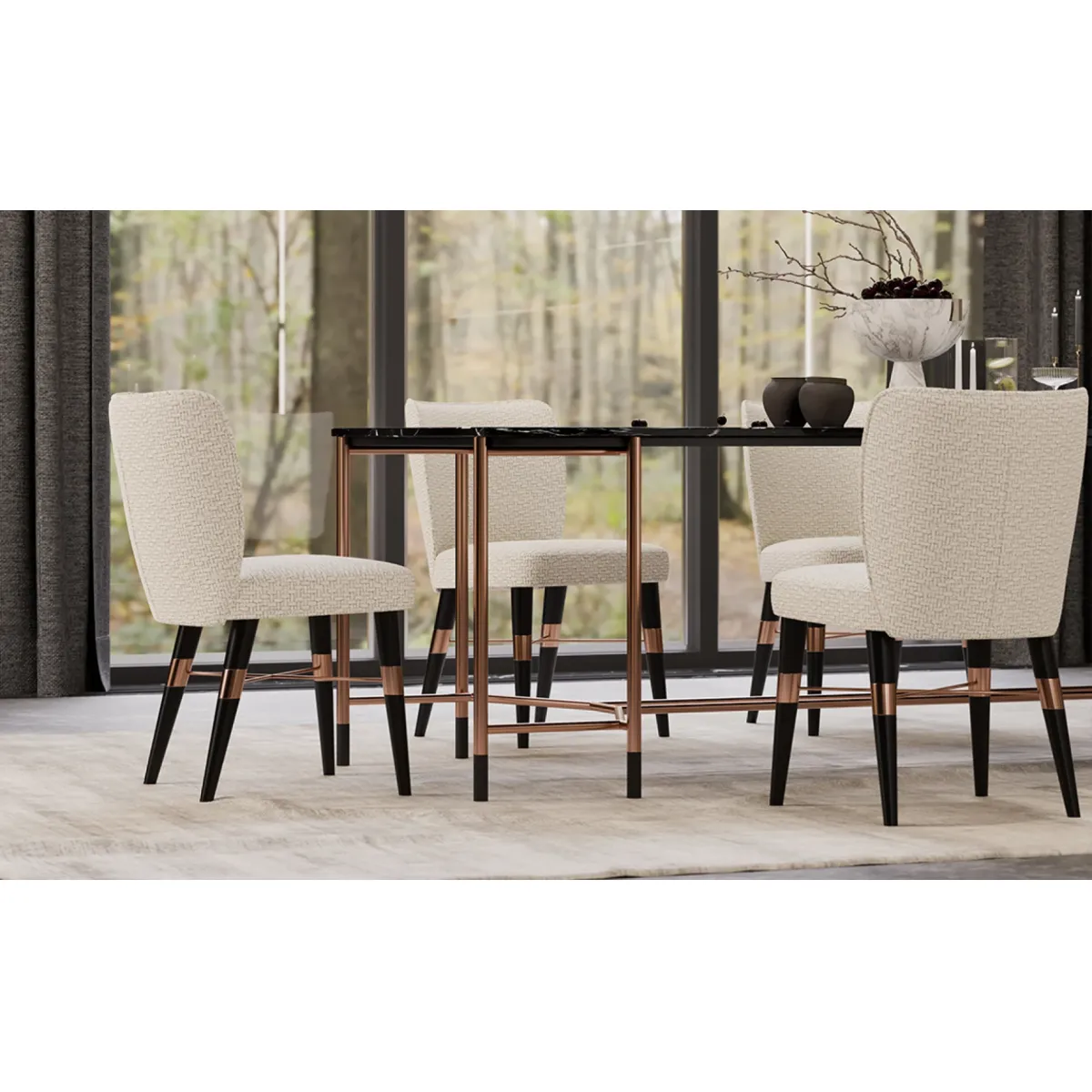 This white upholstered luxury dining chair features sleek black legs with copper accents, combining elegance and modern design. Perfect for upscale dining spaces, it provides both comfort and style, making it a timeless addition to your luxury dining room. Ideal for contemporary interiors.